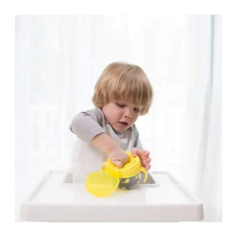 Tvertne ar noņemamu vāku.Zem vāka - elastīgi spārniņi, kas aizsargā, lai kratot tvertni no tās neizbirtu uzkodas, bet vienlaikus ļauj, ieliekot mazo rociņu tvertnē, ērti paņemt ēdienu.Noņemami rokturi - ērtākai turēšanai.Vāks ne tikai palīdz uzturēt tīrību, bet arī ēdiens saglabājas svaigs ilgāk.Viegli izjaucams/saliekams, var mazgāt trauku mazgājamās mašīnas augšējā plauktā.Paredzēts bērniem no 9 mēnešiem.Nesatur BPA.