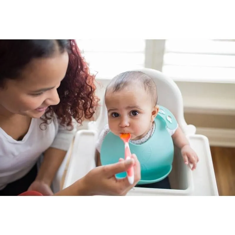 Mīksts, elastīgs karotītes gals nesavainos smaganas. Bērniem no 4 mēnešiem. Mazāk nekārtības, jo uz kātiņa esošā kājiņa tur karotītes kausu paceltu, lai tas nepieskartos galda virsmai. Komplektā četri karotītes. Piemērots bērniem no 4 mēnešiem.