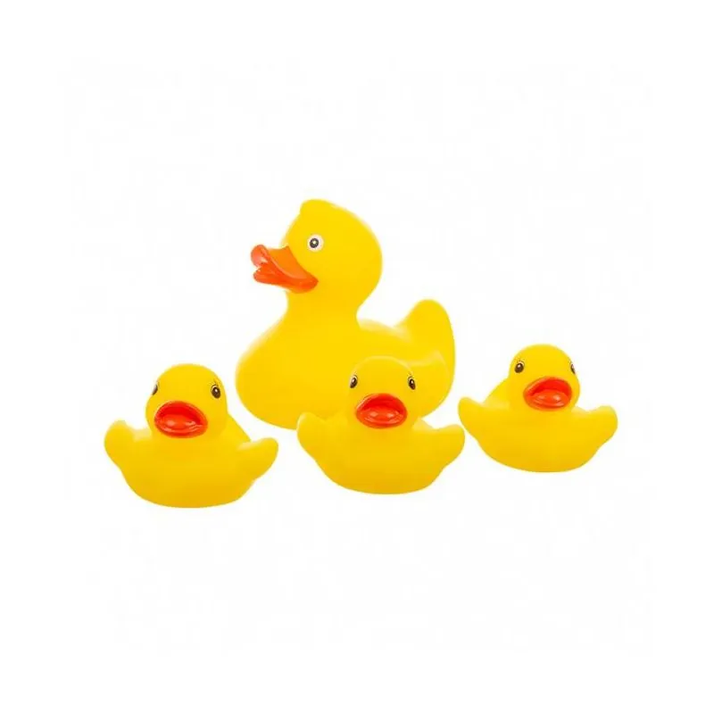 Komplektā ir 4 gumijas rotaļlietas: mamma pīle un 3 mazi pīlēni.