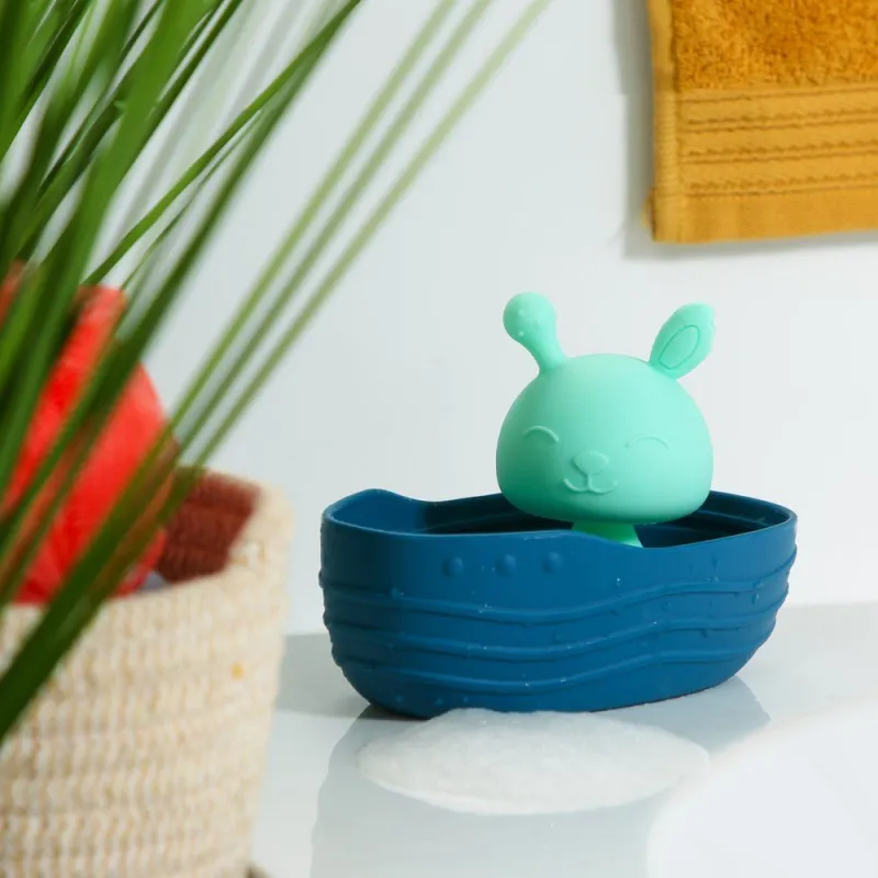 Silikona jūras trusītis ar savu laiviņu aicina mazuļus izpētīt ūdeni;Pateicoties piesūcekņiem, trusīti var piestiprināt pie daudziem gludiem virsmām: galda, bērnu barošanas krēsla, vannas, vannītes vai flīzēm;Trusīša galva šūpojas uz visām pusēm;Ausu tekstūra ir īpaši izstrādāta, lai atvieglotu zobu nākšanas sāpes;Izgatavots no 100% silikona;Laiviņas izmēri: 16x9x5,5 cm.;Trusīša augstums: 11 cm.;Rotaļlieta marķēta ar CE zīmi;Ieteicams bērniem no 10 mēnešu vecuma.
