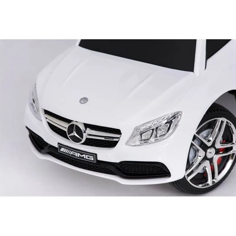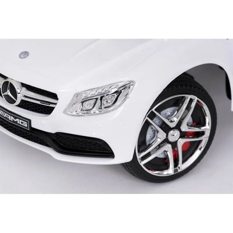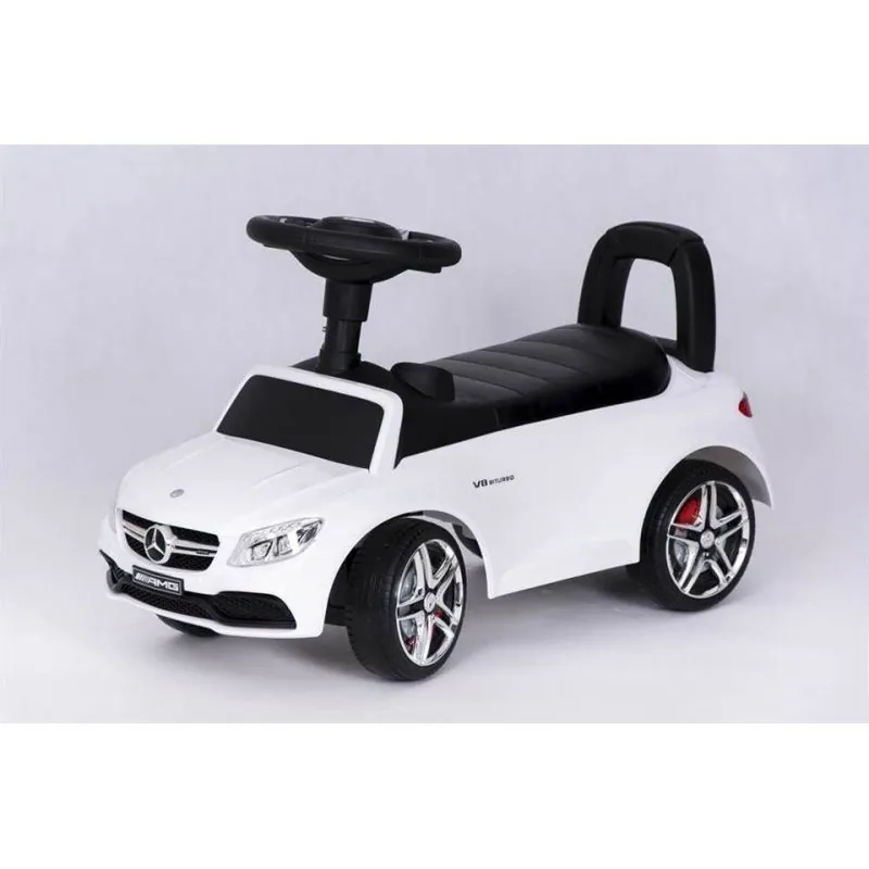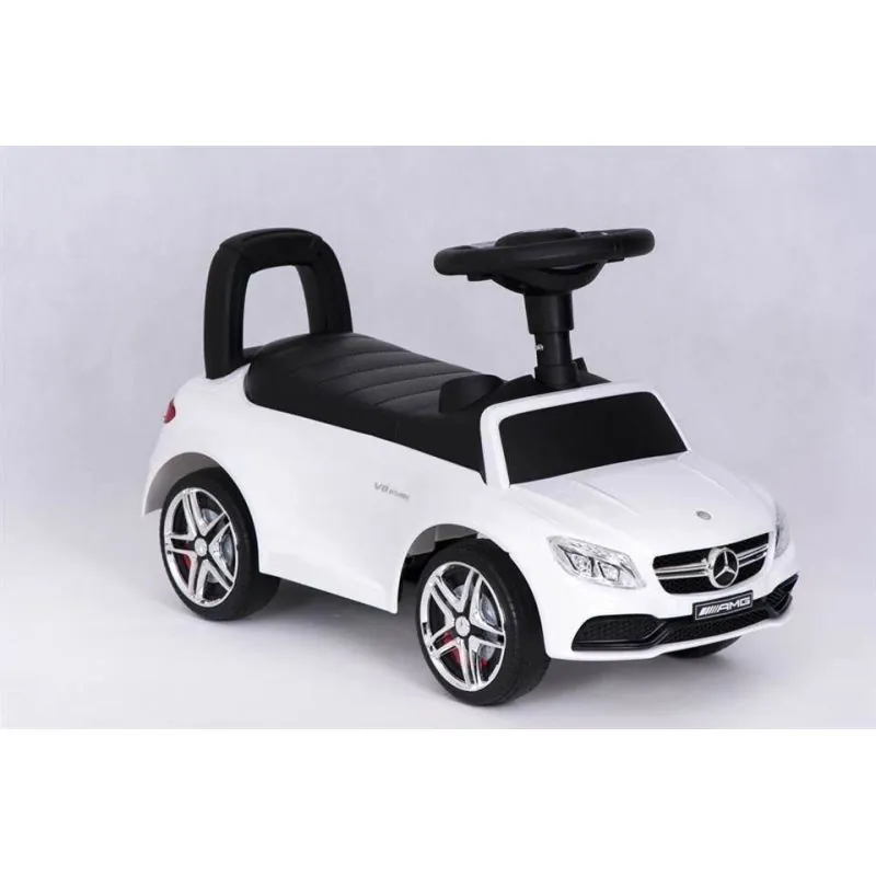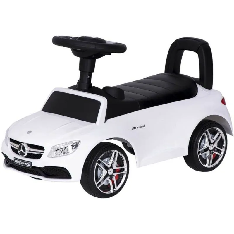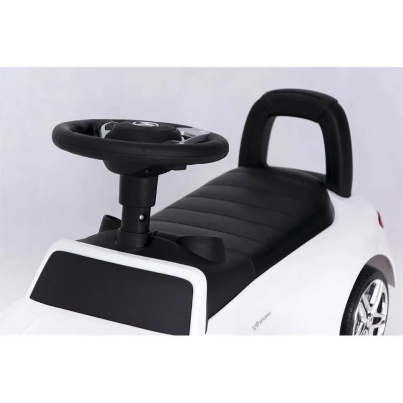 Baltas Mercedes SLS AMG stumjamais auto. Šis modelis ir izgatavots no augstas kvalitātes plastmasas. Ar paceļamu sēdekli un 6 dažādām skaņām.
