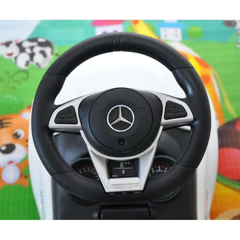 Trīs spieķu stūre ar Mercedes logotipu.Panelis ar skaņas signālu un jautrām melodijām.Glabāšanas kaste zem sēdekļa.Ērts un elegants sēdeklis ar atzveltni.Sēdeklis ar rakstu, kas imitē šūtu ādu.Metāla riteņu asis.Mūsdienīgs izskats.Transportlīdzekļa apgāšanās aizsardzība.Izgatavots no bērniem drošiem materiāliem.Maksimālā slodze - 25 kg.Riteņa diametrs-14 cm.CE drošības sertifikātsBarošana: 2 AA baterijas (nav iekļautas komplektā)Vecuma diapazons 12-36 mēneši.