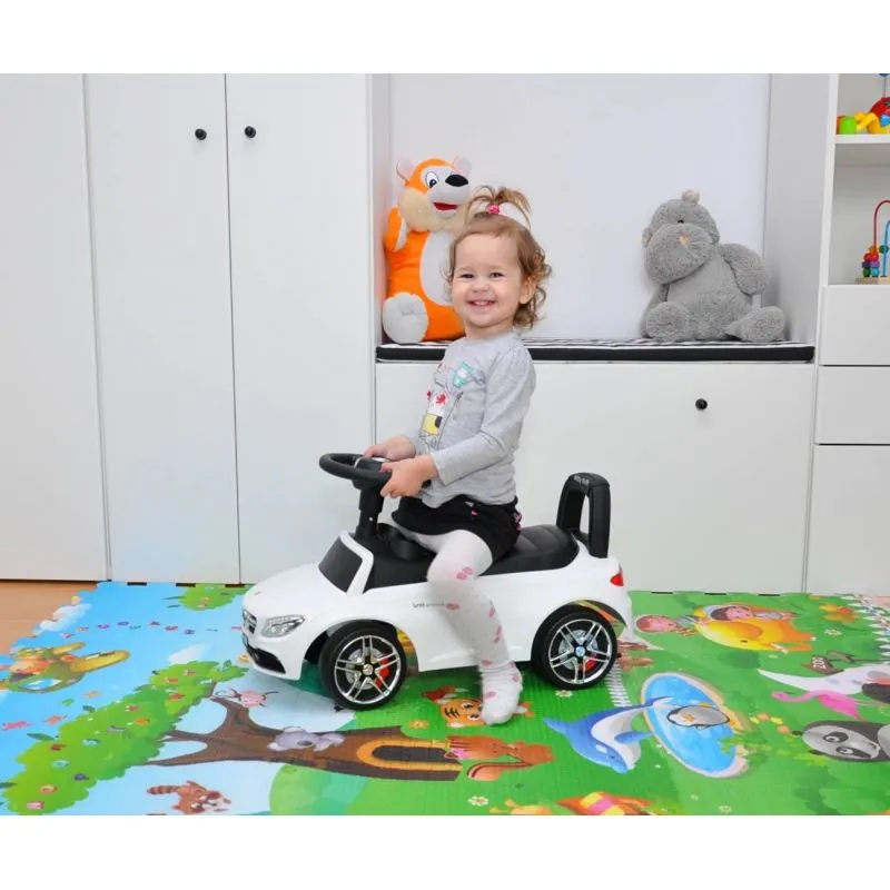 Trīs spieķu stūre ar Mercedes logotipu.Panelis ar skaņas signālu un jautrām melodijām.Glabāšanas kaste zem sēdekļa.Ērts un elegants sēdeklis ar atzveltni.Sēdeklis ar rakstu, kas imitē stepētu ādu.Metāla riteņu asis.Mūsdienīgs izskats.Transportlīdzekļa apgāšanās aizsardzība.Izgatavots no bērniem drošiem materiāliem.Maksimālā slodze - 25 kg.Riteņa diametrs-14 cm.CE drošības sertifikātsBarošana: 2 AA baterijas (nav iekļautas komplektā)Vecuma diapazons 12-36 mēn.