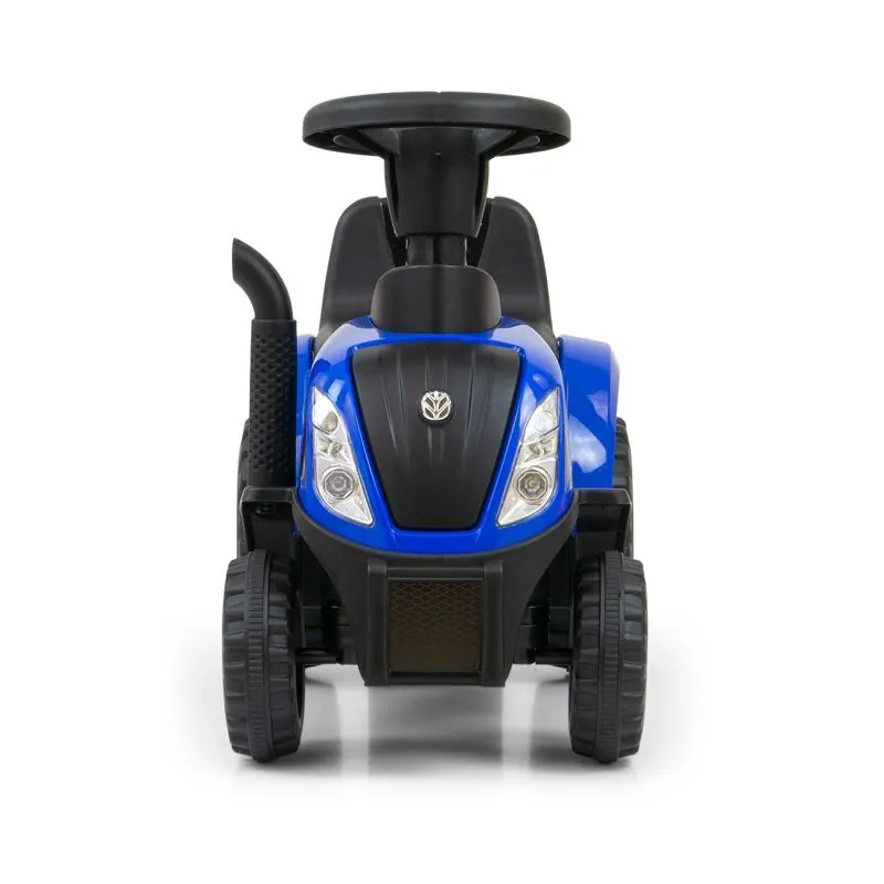 Stūre ar New Holland logotipu.Divas pogas ar skaņas signālu un motora iedarbināšanas skaņām, kā arī iespēju ieslēgt/izslēgt gaismas.Piekabe ar grābekli un lāpstu.Ērts sēdeklis ar atzveltni.Metāla riteņu asis.Aizsardzība pret transportlīdzekļa apgāšanos atpakaļ.Vecums 12-36 mēneši.Riteņa diametrs: priekšējais - 14 cm, aizmugurējais - 20 cm.CE drošības sertifikāts.Barošana: 2 AA baterijas (nav iekļautas komplektā).