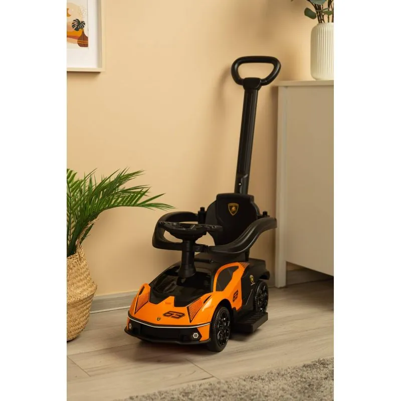 Stilīgs Lamborghini izskatsPagriežami priekšējie riteņi, vadāmi ar stūri vai rokturiTaisnstūrveida stūre ar skaņām (darbojas ar 2xAA baterijām)Izvelkamas kāju balstsKaste zem sēdekļaNoņemami drošības margas un atzveltneAizsardzība pret transportlīdzekļa apgāšanos