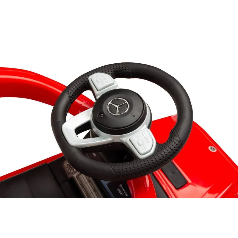 Torsionālie priekšējie riteņi, vadāmi ar rokturi.Trīs spieķu stūre ar Mercedes logotipu, ar skaņas signālu un jautrām melodijām.Šim auto ir aizsardzība pret sānu un atpakaļgaitas apgāšanos, kāju paliktņi un rokturis auto stumšanai.Šos piederumus varēs noņemt, kad bērns vēlēsies braukt ar auto pats.Kaste zem sēdekļa.Ērts un elegants sēdeklis ar atzveltni.Metāla riteņu asis.Noņemami aizsargmargu un atzveltni.Aizsardzība pret transportlīdzekļa apgāšanos.Interaktīvs stūre (3 melodijas un skaņas signāls).Vecums 12-36 mēneši.Riteņa diametrs - 14 cm.CE drošības sertifikāts.Barošana: 2 AA baterijas (nav iekļautas komplektā).