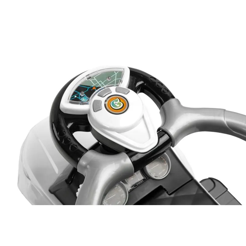 Moderns automašīnas dizainsMazs svars - tikai 3 kgStūre ar gaismām un skaņām (darbojas ar 2 AA baterijām)Kaste zem sēdekļaBarjeras ar aizvēršanas mehānismuĒrts kāju balsts