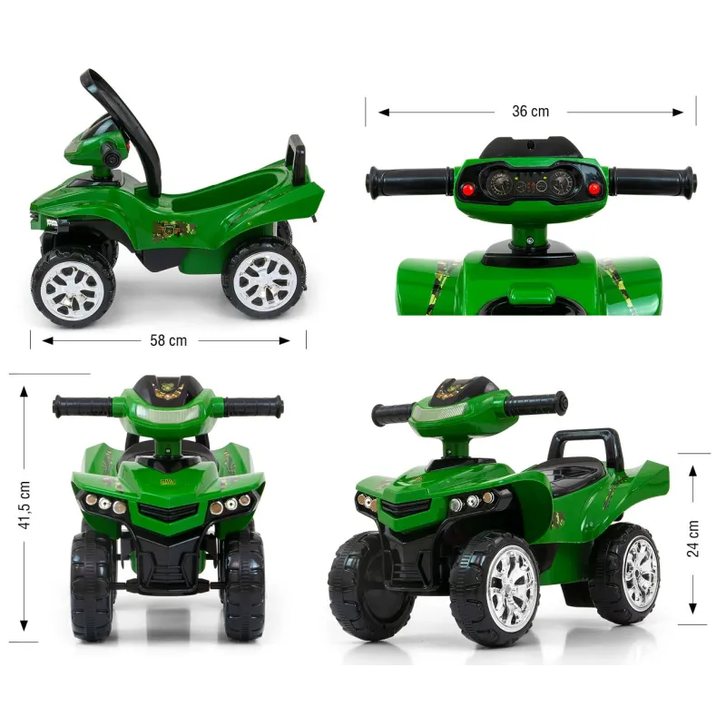 Zem sēdekļa ir uzglabāšanas vieta, kur jūsu bērns var paslēpt savus vērtīgākos dārgumus;Transportlīdzeklī ir uzstādīts interaktīvs stūre ar paneli;Nospiežot pogas, skan dažādas melodijas;Virzīšanas un atgrūšanas darbības pozitīvi ietekmē motorikas koordināciju;Veicina un uztur taustes sajūtu, palielina roku kustību precizitāti;Skaņas signāli un krāsainas gaismas stimulē bērna dzirdi un redzi.