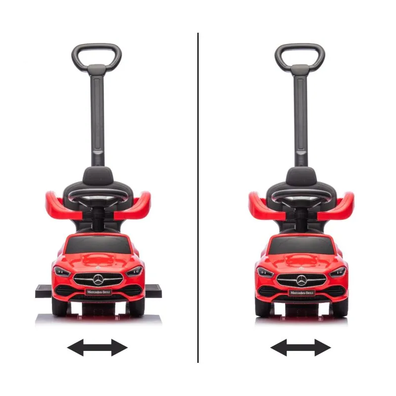 Torsionālie priekšējie riteņi, vadāmi ar stūres sviru;Trīs spieķu stūres rats ar Mercedes logotipu, ar skaņas signālu un jautrām melodijām;Šim auto ir aizsardzība pret sānu un atpakaļgaitas apgāšanos, kāju balsti un rokturis auto stumšanai;Šos piederumus varēs noņemt, kad bērns vēlēsies braukt ar auto pats;Mantkaste zem sēdekļa.Ērts un elegants sēdeklis ar atzveltni;Metāla riteņu asis;Noņemami aizsargmargi un atzveltne;Aizsardzība pret transportlīdzekļa apgāšanos;Interaktīvs stūres rats;Vecums 12-36 mēn.