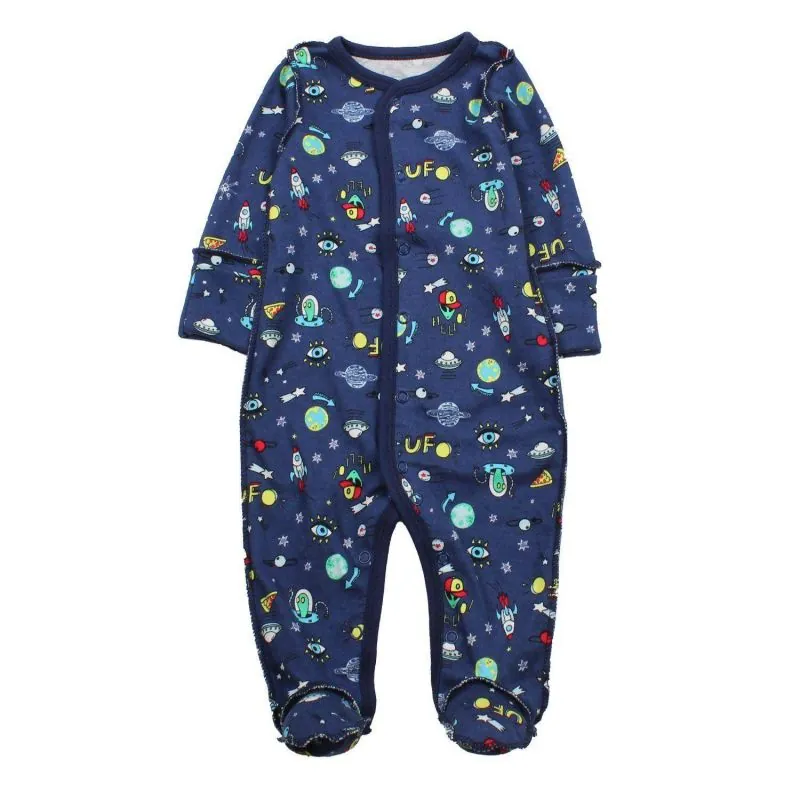 Kokvilnas kombinezons dekorēts ar kosmosa figūrām. Aizdarāms ar spiedpogām visā apģērba garumā priekšpusē. Ar cimdiņiem. Ar apgrieztām šuvēm.