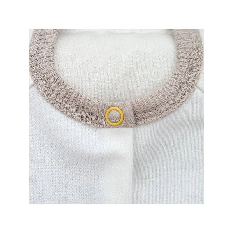Ar garām piedurknēm;Ar atliekamām cimdiņām;Ar aizvērtām pēdiņām;Izgatavots no mīksta un maiga trikotāžas, sertificēta pēc Oeko-tex standarta 100.Aizdarāms ar spiedpogām priekšpusē līdz pat pēdiņām;Apsienams;Augstas kvalitātes apģērbs atbilst ES standartiem.Krāsa: balta;Izgatavots Lietuvā;