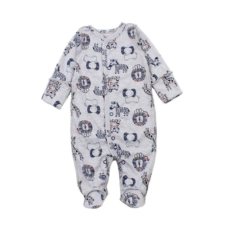 Kokvilnas rāpuļtērps ar apgrieztām šuvēm, kas aizdarāms ar spiedpogām visā garumā priekšpusē.