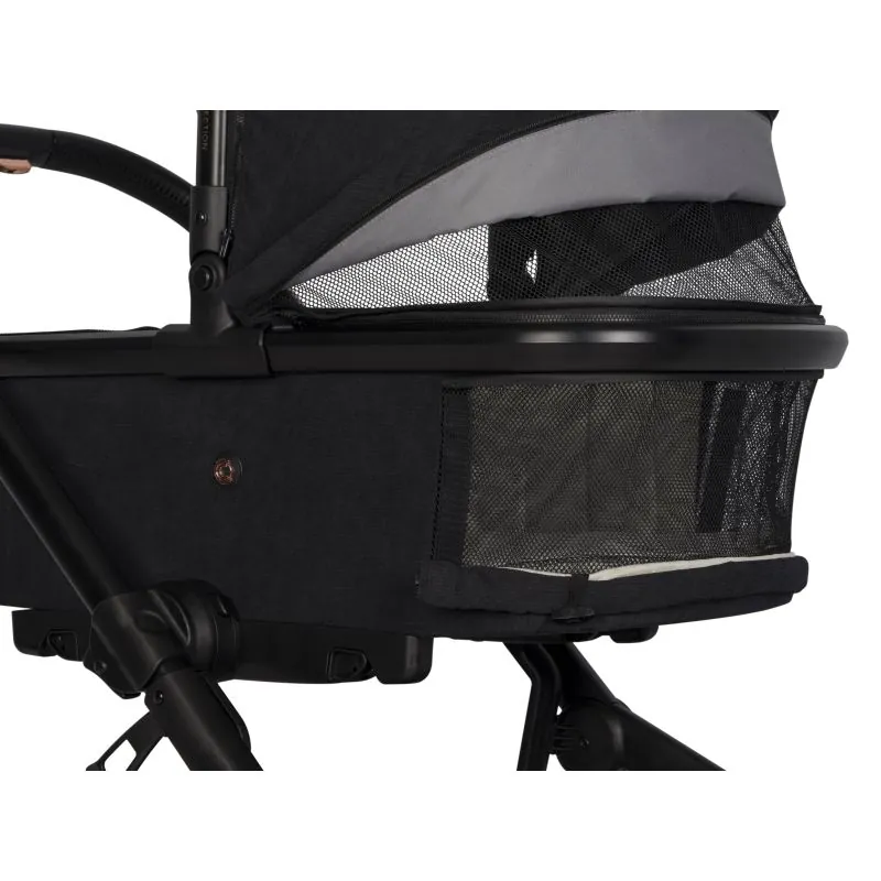 Liels šūpulis (iekšējais garums 77 cm)Šūpulis ar atsevišķu lietus aizsargu,Ekoloģiskas ādas pārklāta nesšanas rokturis,Saules jumtiņš ar papildu noņemamu daļu,Apakšā plastmasas kājiņas un ventilācijas panelis.Plastmasas kājiņas salokās un iespējama šūpuļa šūpošanas funkcija.