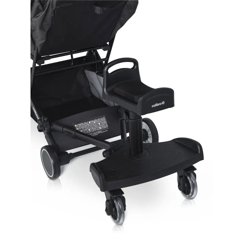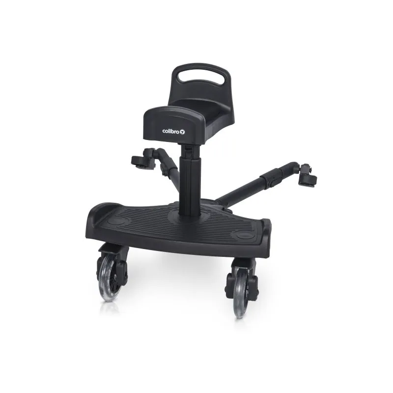 Colibro pagarinājumu var izmantot kā platformu stāvošam bērnam vai kā platformu ar sēdekli, kas ļauj pārvadāt bērnu sēdus stāvoklī. Sēdeklim ir ērta noliekšanas uz priekšu funkcija, lai to nevajadzētu pilnībā noņemt, ja bērns vēlas piecelties un turpināt braukt stāvus. Sēdeklim ir ērts mīksts spilvens, kas pildīts ar speciālām putām, nodrošinot komfortu sēdošam bērnam.Montāžas sistēma ļauj savienot ar lielāko daļu tirgū esošo ratiņu (ne vienmēr ar Colibro ratiņiem). Rokturus var regulēt 2 plaknēs: teleskopiskā garuma un horizontālā regulēšana. Teleskopiskā garuma regulēšana ļauj pietuvināt pakāpienu ratiņu konstrukcijai.Horizontālā regulēšana palielina vai samazina sviras leņķi, kas ļauj pielāgot ratiņu platumam. Turklāt pagarinājumam ir vertikālā plaknē regulējamas sviras, kas vienlaikus palīdz pareizi izlīdzināt platformu attiecībā pret zemi. Rokturus pie ratiņu konstrukcijas elementiem piestiprina ar speciāliem skavām ar elastīgām regulējama garuma siksnām.Cietās gumijas riteņi ir aprīkoti ar amortizatoru.Riteņi ir grozāmi, tāpēc tie neaizslēgsies, kad pagriežat ratiņus.Piemērots bērniem no 15 mēnešiem līdz 20 kg svara.