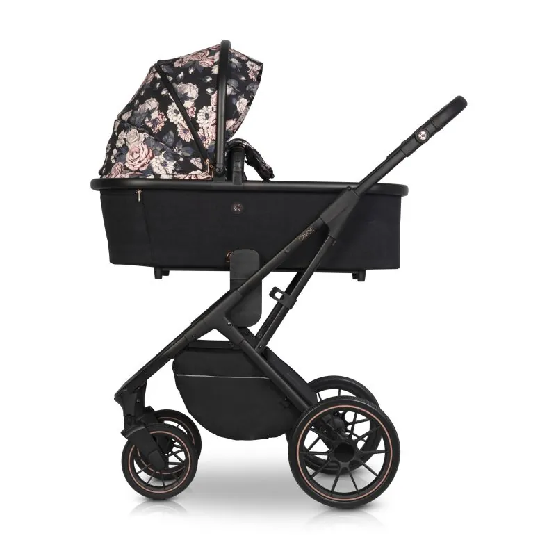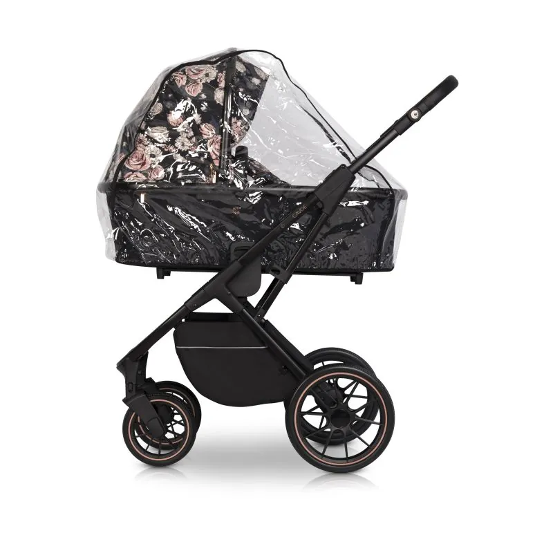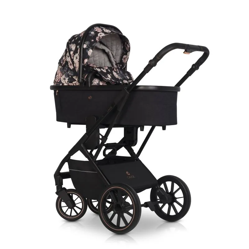 iekšējais garums 79 cm,matracis no biezas putuplasta, kas raksturojas ar lielu elastību,lietus pārsegs,eko ādas pārklāta roktura ar dekoratīvām šuvēm,saules jumtiņš ar papildu rāvējslēdzēja daļu,plastmasas kājiņas šūpuļa apakšā, kas ļauj to novietot uz zemes,iespēja salocīt šūpuli, lai to varētu uzglabāt vai transportēt.