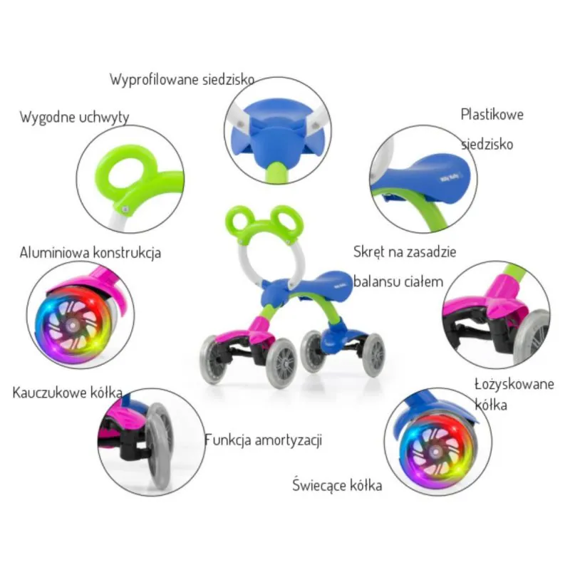Velosipēda dakša: alumīnijs.Rāmis: alumīnijs.Riteņi: gumijas ar diodēm.Sēdeklis: plastmasa (bez regulēšanas).Ieteicamais vecums: 10-24 mēneši.Maksimālā slodze: 20 kg.Augstums: 64 cm.Augstums (no sēdekļa līdz grīdai): 27 cm.Kopējais garums: 64 cm.Platums: 23 cm.Riteņu diametrs: 12 cm.Svars: 2.6 kg.