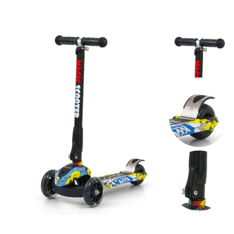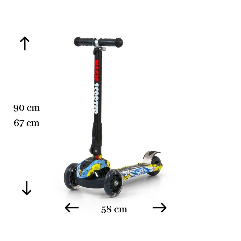 Viegls un izturīgs dizains (alumīnijs, stikla šķiedra, PVC);Ērti rokturi;Regulējams rokturu augstums;Trīs riteņi nodrošina stabilitāti;Bērniem no 3+ gadu vecuma;Pārvietojoties priekšējie riteņi spīd;Maksimālā slodze līdz 50 kg;Aprīkots ar bremzi - aizmugurējais spārns;Riepas, izgatavotas no augstas kvalitātes gumijas, nodrošina labāko veiktspēju.Skrejriteņa garums: 58 cm;Regulējams roktura augstums 67-90 cm;Platums - 25 cm;Priekšējo riteņu diametrs - 12 cm, aizmugurējā - 10 cm;