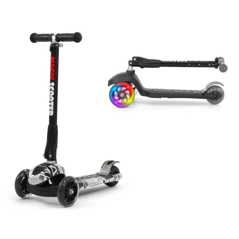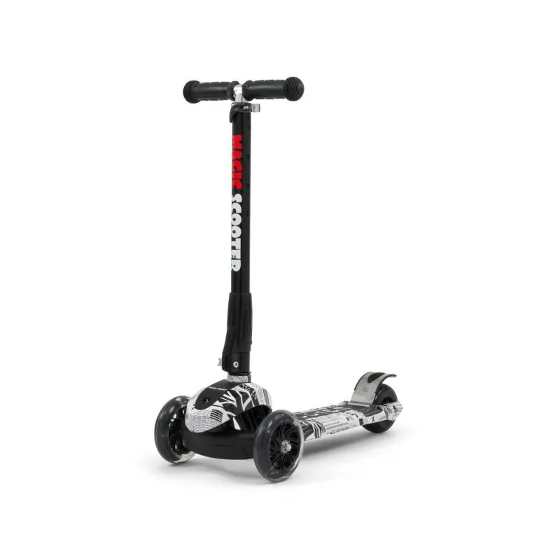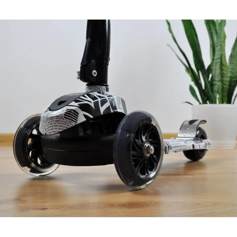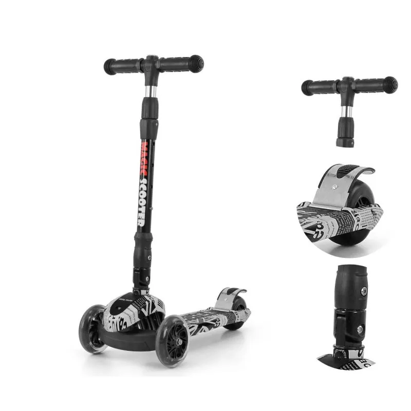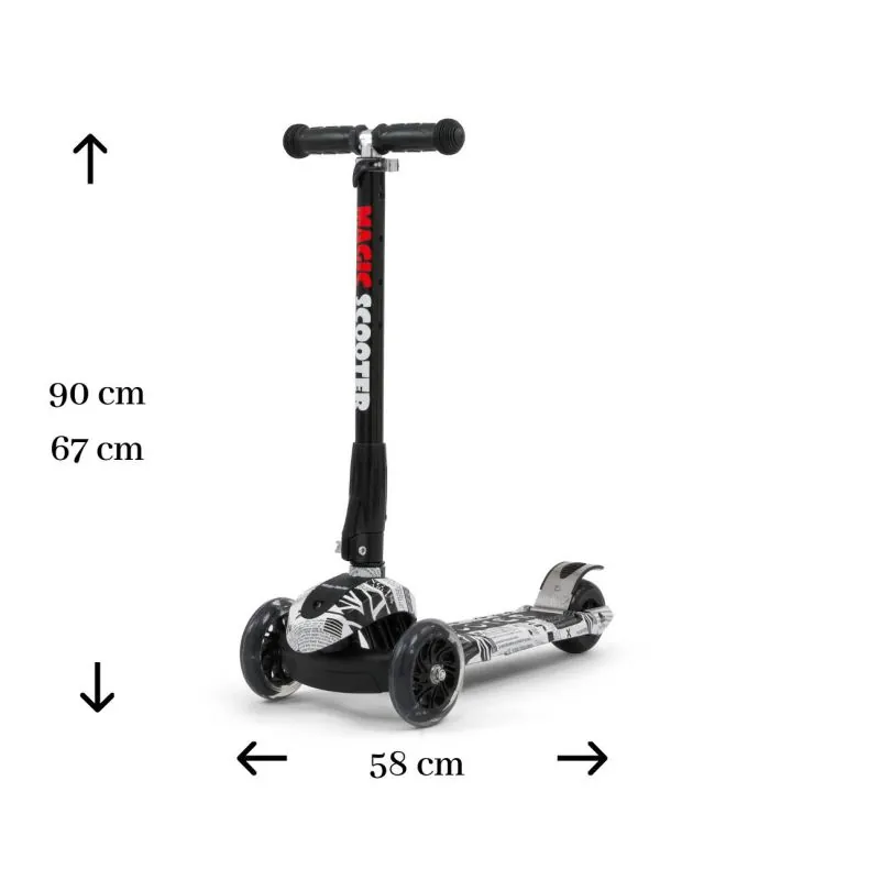 Viegls un izturīgs dizains (alumīnijs, stikla šķiedra, PVC);Ērti rokturi;Regulējams rokturu augstums;Trīs riteņi nodrošina stabilitāti;Bērniem no 3+ gadu vecuma;Priekšējie riteņi kustoties spīd;Maksimālā slodze līdz 50 kg;Aprīkots ar bremzi - aizmugurējais spārns;Riepas, kas izgatavotas no augstas kvalitātes gumijas, nodrošina labāko veiktspēju.Skrejriteņa garums: 58 cm;Regulējams roktura augstums 67-90 cm;Platums - 25 cm;Priekšējo riteņu diametrs - 12 cm, aizmugurējā - 10 cm;