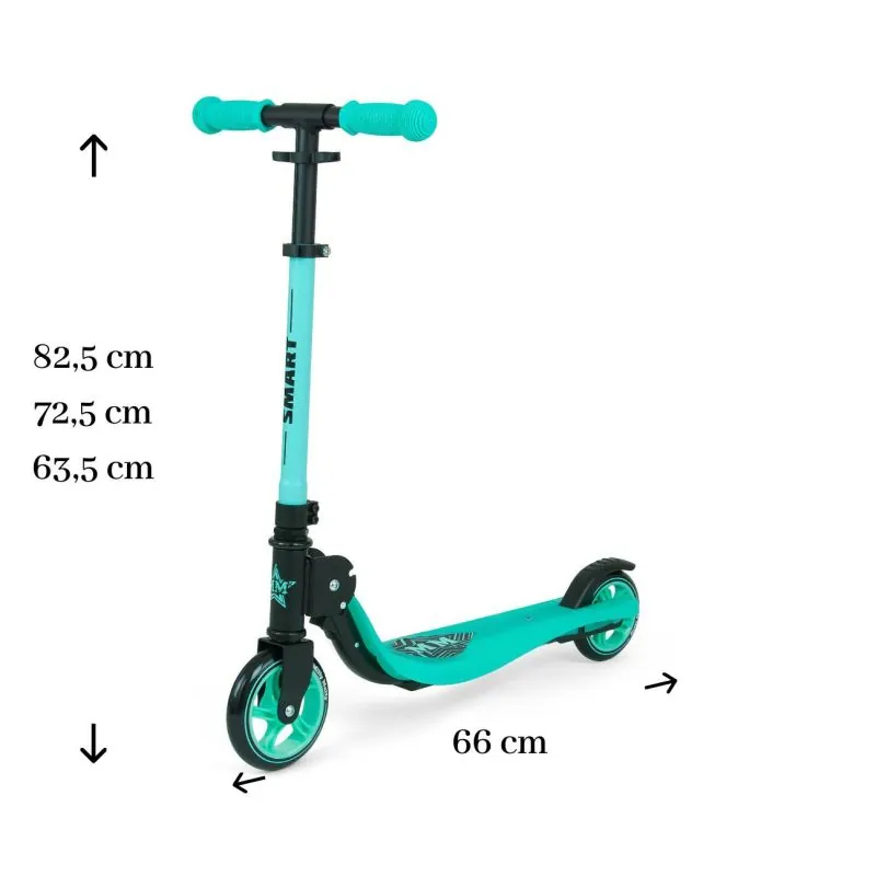 Vieglā un izturīgā plastmasas platforma - ar neslīdošu virsmu, balstīta uz metāla rāmja. Alumīnija stūre. Inovatīva salokāma sistēma.Gumijas neslīdoši stūres rokturi. Regulējams stūres augstums 3 līmeņos: 63,5 cm x 72,5 cm x 82,5 cm. Gumijas riteņi izgatavoti no augstākās kvalitātes PU materiāla, neslīd un nodrošina atbilstošu saķeri. ABEC-5 gultņi. Aizmugurējā riteņa bremze. Maksimālais svars līdz 50 kg.
