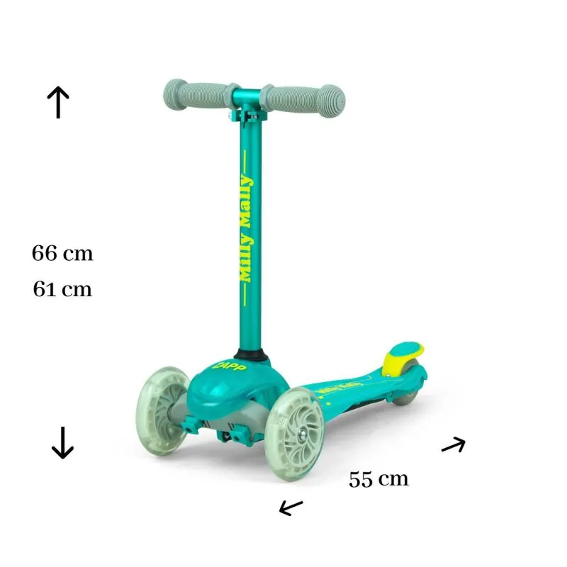Regulējams stūres augstums: 61-66 cm.Stūres platums: 28 cm.Garums: 55 cm.Platformas platums: 11,5 cm.Platformas garums: 31 cm.Platformas augstums no zemes: 6 cm.Priekšējo riteņu diametrs: 12 cm.Aizmugurējā riteņa diametrs: 8 cm.Maksimālā slodze līdz 50 kg.Produkta svars: 2,24 kg.EN71 standarts.