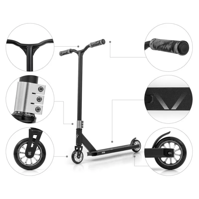 MMX kaskadieru skrejriteņi Buster ir izgatavoti no augstas kvalitātes materiāliem, kas nodrošina ļoti labu drošības līmeni, braucot brīvā stilā.Buster skrejriteņa konstrukcijā apvienots alumīnijs un tērauds, kas nodrošina mazu svaru, saglabājot pietiekamu stingrību un ļoti labu stabilitāti.„Buster“ triku skrejritenis ir optimāla aprīkojuma izvēle iesācējiem, kas vēlas apgūt trikus.Plata pastiprināta stūres konstrukcija un gumijas rokturi kopā ar izturīgu termoplastisko gumiju TPR garantē ļoti labu saķeri, kas ir drošības garantija.Riteņi izgatavoti no ļoti labas kvalitātes poliuretāna ar neilona serdi un ABEC-7 gultni – tas apvieno stabilitātes, kvalitātes un drošības garantiju.Atbilst EN 14619: 2019 standartam, A klasei.Maksimālā slodze: līdz 100 kg.Ieteicamais vecums: 8+