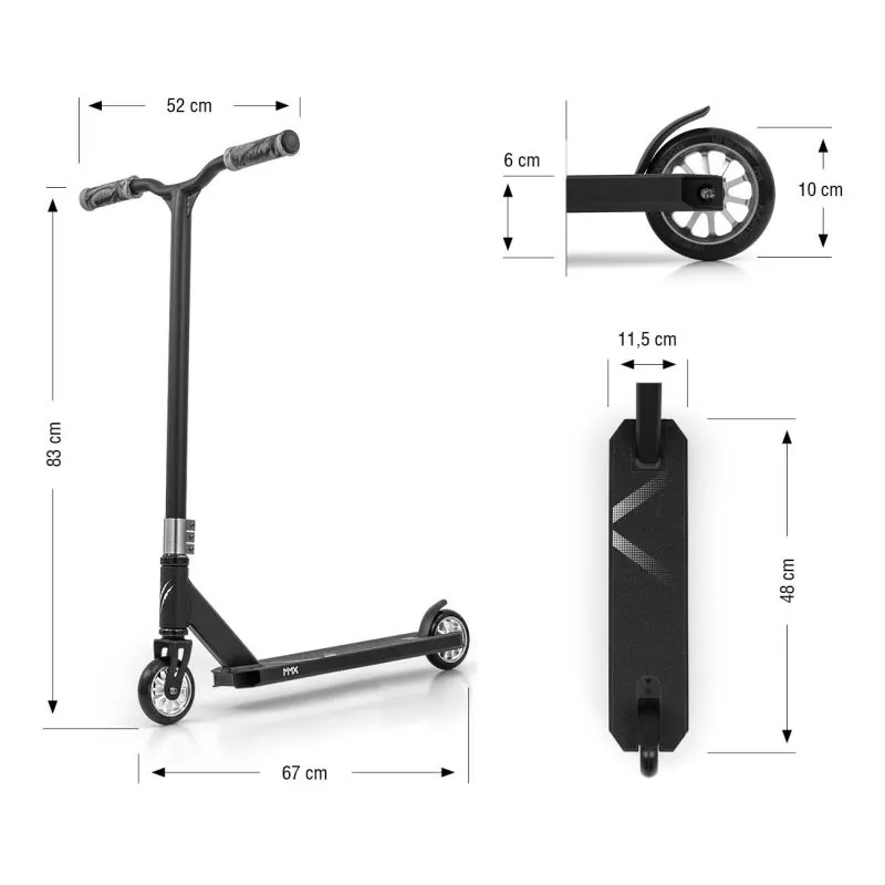 Stūres augstums: 83 cm.Stūres platums: 52 cm.Kopējais garums: 67 cm.Platformas garums: 48 cm.Platformas platums: 11,5 cm.Platformas augstums no zemes: 6 cm.Riteņa diametrs: 100 mm.IEPAKOJUMA IZMĒRS: 66,5 x 12 x 51,5 cm.Svars: 4,4 kg.