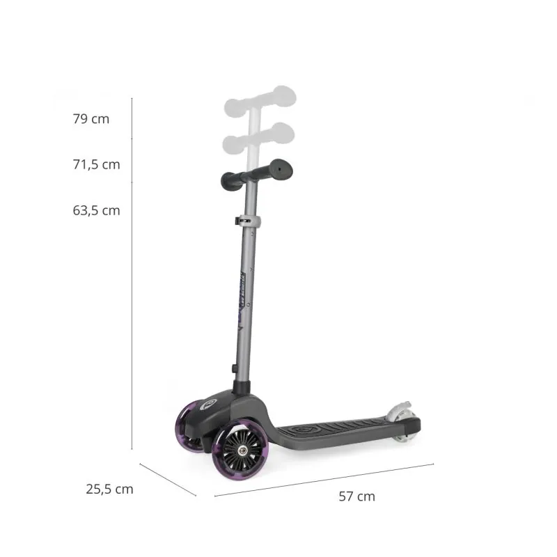 Kopējais augstums: 81 cm;Augstums – stūres regulēšanas līmeņi: 63,5 cm / 71,5 cm / 79 cm Stūres platums: 25 cm;Kopējais garums: 57 cm;Platformas garums: 29 cm;Platformas platums: 15 cm;Platformas augstums no zemes: 6 cm;Priekšējo riteņu diametrs: 12 cm;Riteņu bāze: 25,5 cm;Aizmugurējā riteņa diametrs: 8 cm
