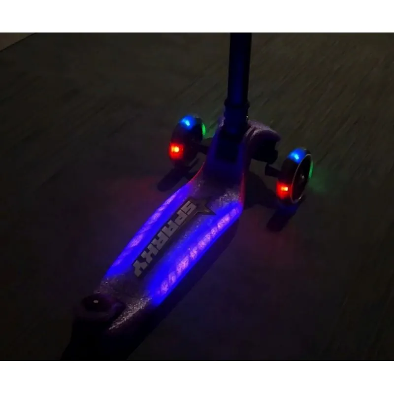 Pateicoties 4 pakāpju roktura regulēšanai, SPARKY skrejritenis aug kopā ar jūsu bērnu, pielāgojoties viņa augumam un vajadzībām. Vienkāršā salocīšanas sistēma ļauj ātri salocīt skrejriteni un ņemt to līdzi jebkur – bez jebkādām grūtībām.Sparky izceļas ar spīdošiem LED priekšējiem riteņiem, papildu platformas un garenisko līniju sānu apgaismojumu, kas kopā rada patiesi iespaidīgu gaismu šovu braucot – lieliski piemērots vakara izbraucieniem! Spīdīgā apdare liek skrejritenim iespaidīgi mirdzēt saulē.