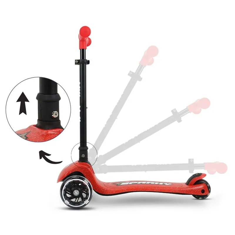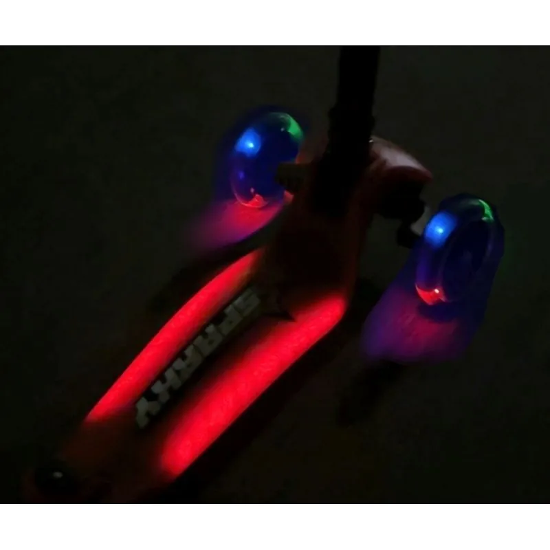 Pateicoties 4 pakāpju roktura regulēšanai, SPARKY skrejritenis aug kopā ar jūsu bērnu, pielāgojas viņa augumam un vajadzībām. Vienkāršā salocīšanas sistēma ļauj ātri salocīt skrejriteni un paņemt to līdzi jebkur – bez jebkādām grūtībām.Sparky izceļas ar spīdošiem LED priekšējiem riteņiem, papildu platformas un garenisko līniju sānu apgaismojumu, kas kopā rada patiesi iespaidīgu gaismas šovu braucot – lieliski piemērots vakara izbraucieniem! Spīdīgā apdare liek skrejritenim iespaidīgi mirdzēt saulē.