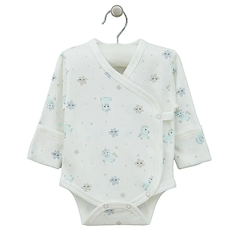 Aptinamais kokvilnas bodijsAizveramas cimdiņšIzgatavots no OEKOTEX sertificētas un mīkstas 100% kokvilnasKrāsa: baltaMazgāt automātiskajā veļas mašīnā 40 grādu temperatūrāRažots Lietuvā