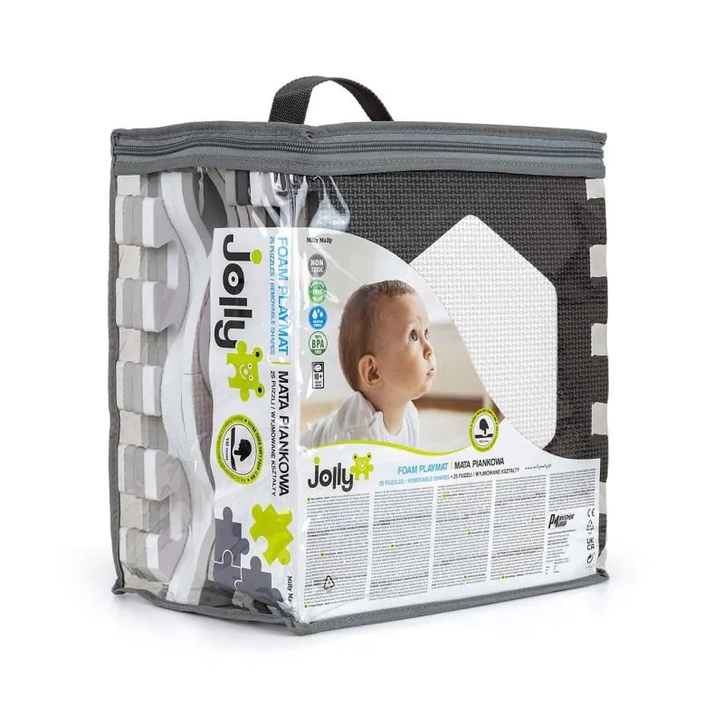 Izgatavots no mīksta kvalitatīva 1,2 cm bieza putu materiāla;36 atsevišķas daļas;Var salikt kā plakanu paklājiņu vai ar malām;Spēlējot veicina bērna spēju atšķirt formas;Spēlējot ar puzles detaļām var attīstīt bērna smalko motoriku un roku koordināciju;Lieliski piemērots kā spēļu paklājiņš;Izgatavots no drošiem, visām prasībām atbilstošiem materiāliem;Ir izturīgs un viegli tīrāms;Paklājiņš lieliski piemērots lietošanai telpās;Tas ir elastīgs un drošs bērniem – nodrošina mīkstu virsmu spēlēšanai, vienlaikus izolējot no aukstuma vai grīdas cietības; JOLLY putu paklājiņš ir ne tikai lieliska izklaide, bet arī lieliski atbalsta mazu bērnu attīstību caur aktīvām un izglītojošām aktivitātēm; Paklājiņu viegli var iepakot caurspīdīgā maisiņā, tāpēc to varēsiet ņemt līdzi ceļojumā; JOLLY putu paklājiņš ieteicams bērniem no 10 mēnešu vecuma;Pirms lietošanas izlasiet lietotāja rokasgrāmatu.Garums: 148 cm.;Platums: 148 cm.; Biezums: 1,2 cm.; Izmēri ar malām uz augšu: 119,5 x 119,5 x 16,5 cm.; Vienas puzles izmēri: 31,5 x 31,5 cm. 36 atsevišķas detaļas; 16 pilnas puzles ar formām: 31,5 x 31,5 cm.;16 sānu puzles: 31x16,5 cm.; 4 puzles – ceturtdaļas aplis (stūri); Caurspīdīgs iepakojums;Neto svars: 2,28 kg.