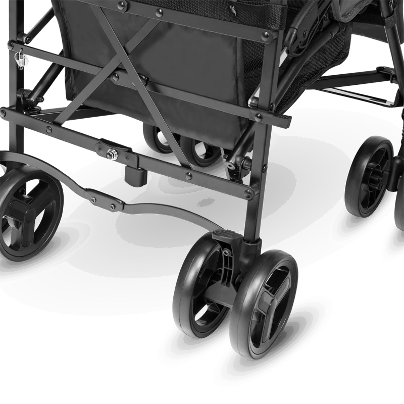 Ļoti izturīga, viegla konstrukcija – tikai 7 kg.komplektā ir moskītu tīkls, kāju pārsegs.Atzveltnes un kāju balstu regulēšana.Liels iepirkumu grozs.Ātri un viegli salokāma sistēma.Aizmugurējā riteņa bremze.Ērts nesšanas rokturis.