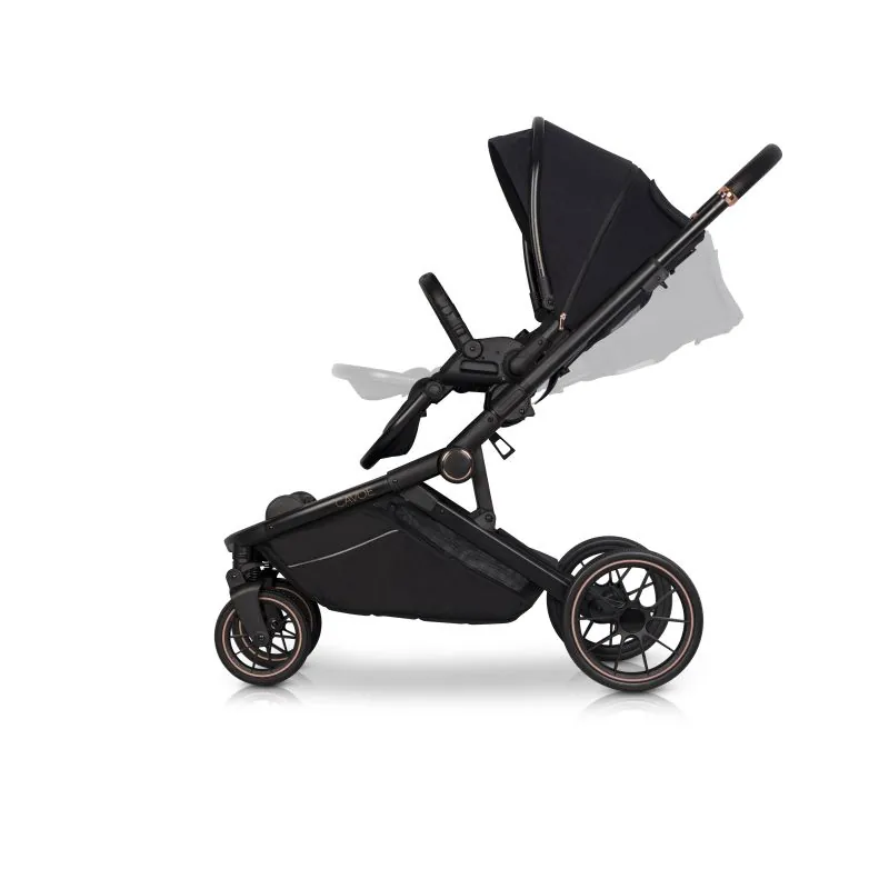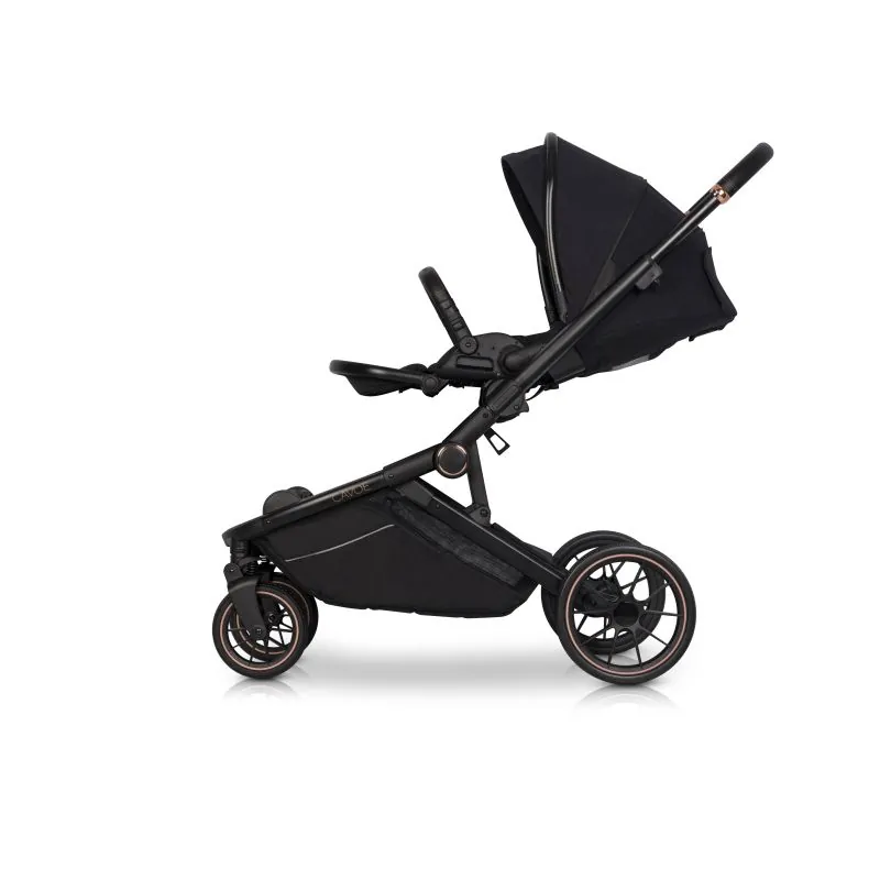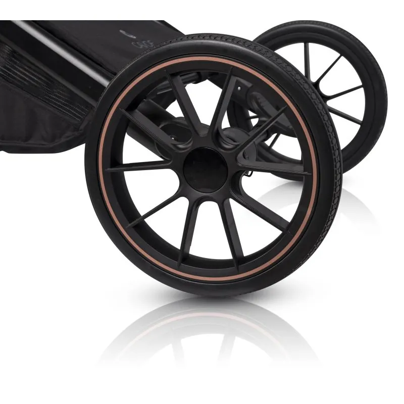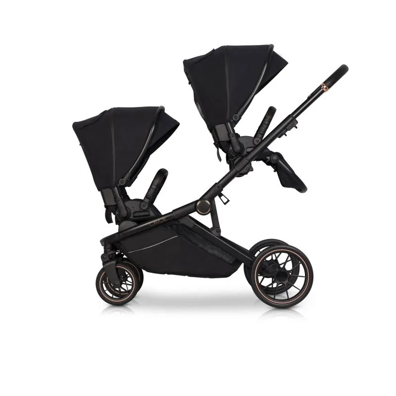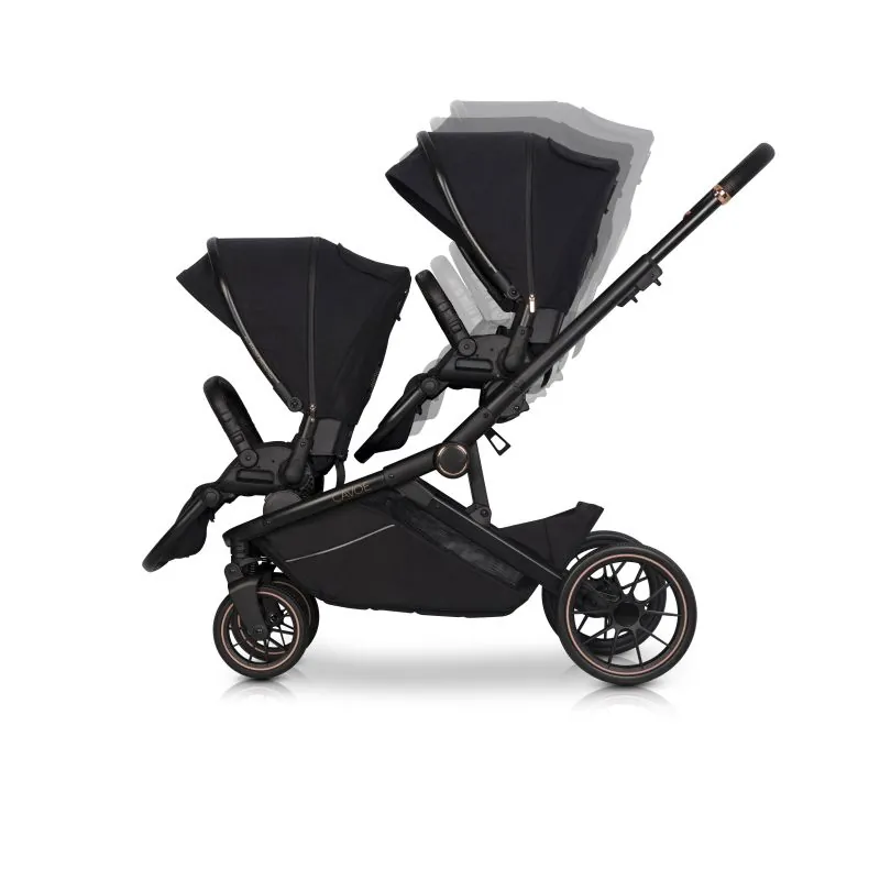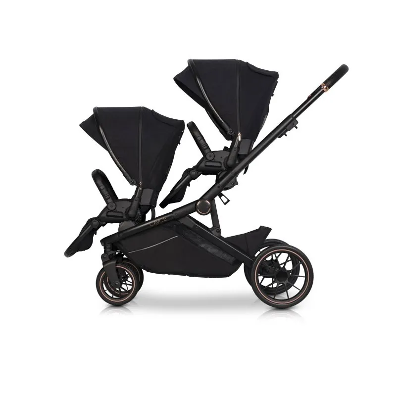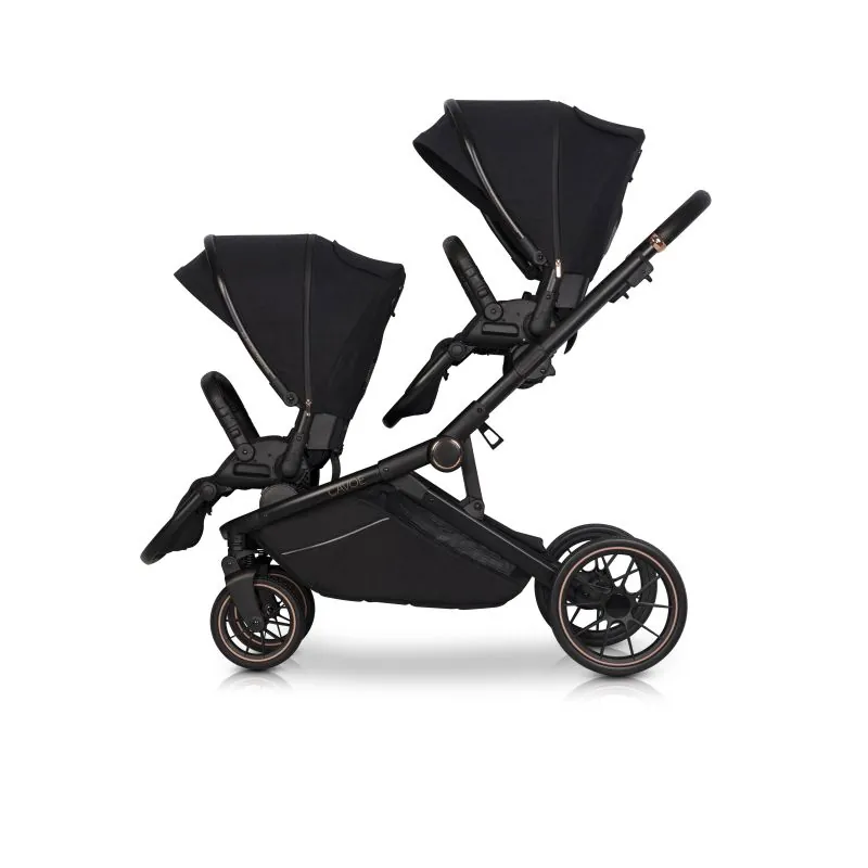 EN 1888: 2012 standarta atbilstības sertifikātsNoņemami sēdekļi (var uzstādīt uz priekšu un atpakaļ)Inovatīva aizmugures moduļa augstuma regulēšanas sistēma,Teleskopiska roktura augstuma regulēšana (vadotne),3 pakāpju atzveltnes regulēšana sēdekļos un regulējams kāju balstsLieli riteņi ar gultņiem un gumijas riepām (lieliska saķere arī uz sniega),Sēdekļi ar 5 punktu drošības jostām, piemēroti bērniem līdz 15 kgBuomeliai un rokturis pārklāti ar ekoloģisku āduLietus aizsardzība, kas aptver visu ratiņu apdari (atsevišķi katram sēdeklim)Tīkls pret kukaiņiem (atsevišķi katram sēdeklim)Kāju pārsegs (atsevišķi katram sēdeklim)Jumtiņos ir ventilācijas tīkliPašizlīdzinoši priekšējie riteņi ar iespēju bloķēt braucot taisni,Liels iepirkumu grozs zem ratiņiem (viegla piekļuve grozam, pateicoties atloka aizmugurē),Atstarojošs elements uz groza (labāka redzamība un drošība)Var atsevišķi iegādāties šūpuli, mammas somu un automašīnas sēdekli, kā arī adapterus.
