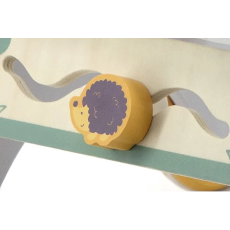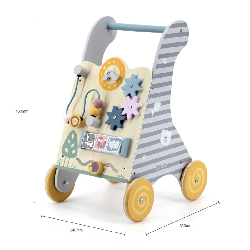 Daudzfunkcionāls koka staigulis ar gumijas riteņiem un daudz interesantu aktivitāšu. Izgatavots no augstas kvalitātes koka, pārklāts ar bērniem nekaitīgām krāsām.Uz staiguļa priekšējās sienas ir daudz spēles elementu, kas attīstīs bērna motoriskās prasmes, veicinās radošumu.Pagriežamas, kustīgas detaļas, labirints, skaitīkļi, pulkstenītis, zobrati.Ieteicamais vecums: 18+ mēn.Izmēri: 30x48,5x34,5cm.