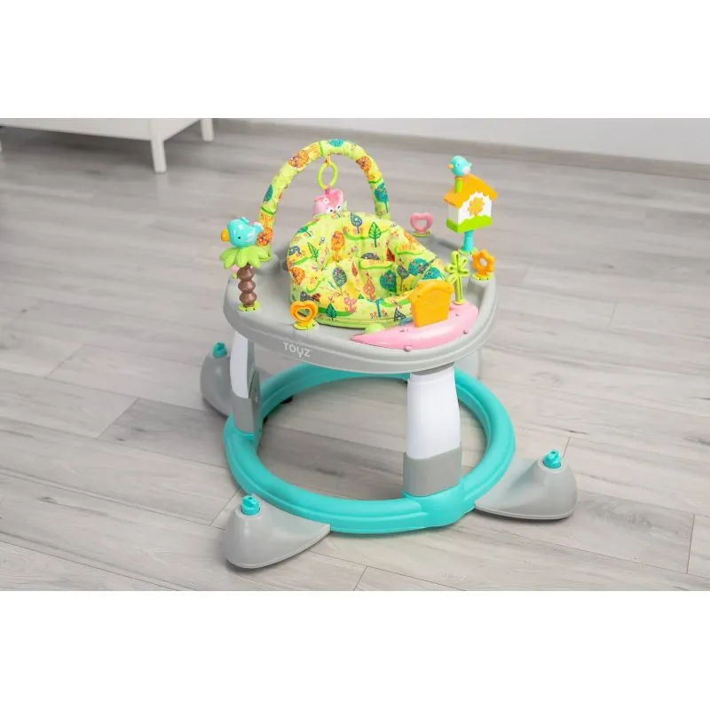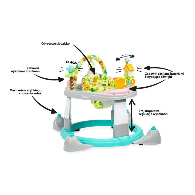 „Toyz Aloha“ ir staigulis ar izglītojoša galda funkciju, kas pieder produktu līnijai „Activity“, kas izceļas ar to, ka atbalsta bērna attīstību. Tāpēc staigulī „Aloha“ ir daudz rotaļlietu, kas ilgi aizraus jūsu bērnu. Interaktīvs panelis ar pogām.Plaša sensoru rotaļlietu izvēle (grabuliņi, čīkstošas un skanošas rotaļlietas).360 ° rotējošs sēdeklis ļaus jūsu mazulim viegli sasniegt visas rotaļlietas. Sēdeklis nodrošina pareizu bērna stāju lietošanas laikā.Staiguli var ātri pārvērst par galdu, izmantojot četras rokturus ar slēdzeni, kas atrodas uz riteņiem.Visi riteņi griežas, lai būtu ērti pārvietoties.3 soļu sēdekļa augstuma regulēšana (25 cm, 27 cm, 30 cm).Paredzēts bērniem no 6 mēnešiem līdz 12 kg.Atbilst EN 71 drošības prasībām.