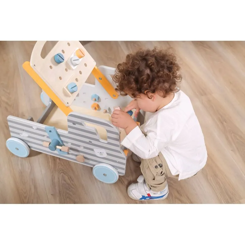 Komplektā ietilpst darbnīca uz riteņiem, nepieciešamie instrumenti, skrūves un lentes.Jūs varat iedzīt naglas, pievilkt skrūves ar uzgriežņu atslēgu, ieskrūvēt koka līstes un plauktus.Tas viss ērti salokāms automašīnas virsbūvē.Rotaļlieta ļaus atcerēties instrumentu nosaukumus un iemācīties tos izmantot.Izgatavots no augstas kvalitātes koka un krāsots ar drošām netoksiskām krāsām.Rotaļlieta attīsta smalko motoriku, iztēli, roku un acu koordināciju, radošumu.