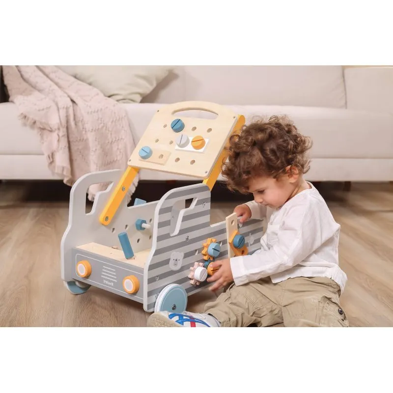 Komplektā ietilpst darbnīca uz riteņiem, nepieciešamie instrumenti, skrūves un lentes.Jūs varat iedzīt naglas, pievilkt skrūves ar uzgriežņu atslēgu, ieskrūvēt koka līstes un plauktus.Tas viss ērti salokāms automašīnas virsbūvē.Rotaļlieta ļaus atcerēties instrumentu nosaukumus un iemācīties tos izmantot.Izgatavots no augstas kvalitātes koka un krāsots ar drošām netoksiskām krāsām.Rotaļlieta attīsta smalko motoriku, iztēli, roku un acu koordināciju, radošumu.