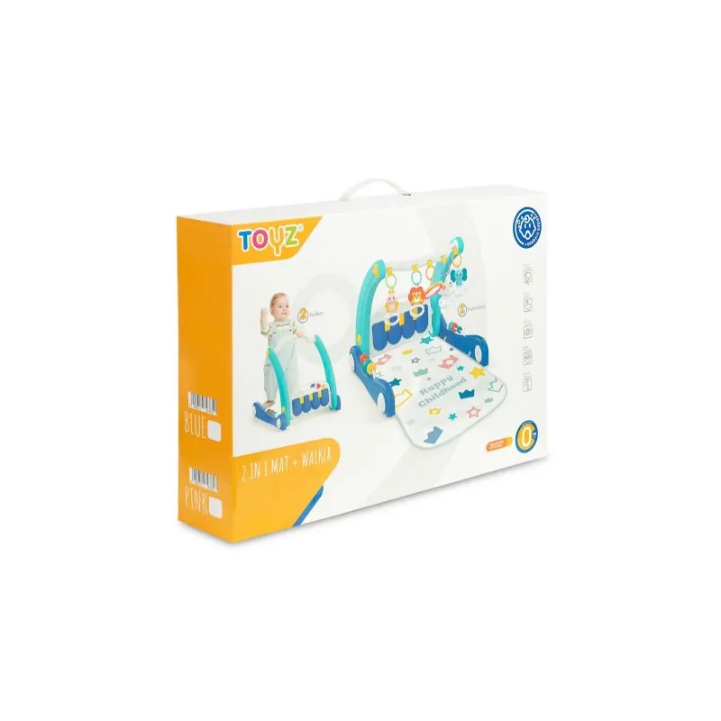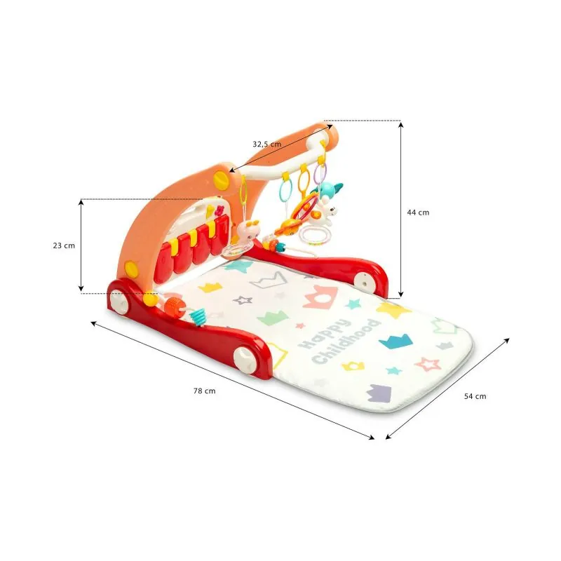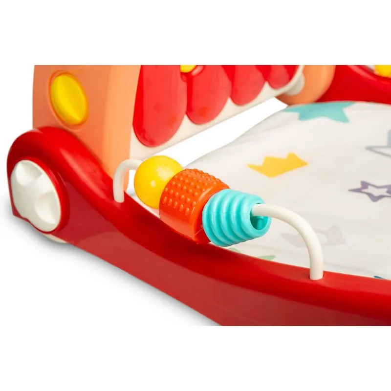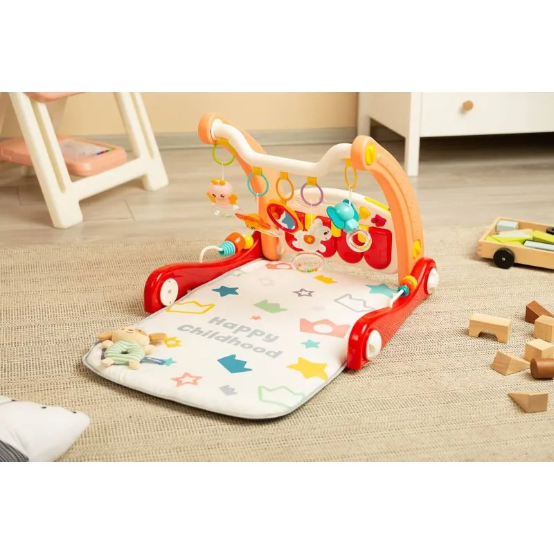Kilimėlyje yra buomelis su pakabintais gyvūnėlių formos barškučiais ir veidrodžiu. Atlaisvinę priekinius ratus ir nuėmęs kilimėlį žaislas pavirsta į vaikštynę.Daugialypės terpės skydelis su dideliais mygtukais, o šonuose montuojami sensoriniai žaislai padės vaiko vystymuisi. Žaislas tinka vaikams nuo pirmųjų gyvenimo akimirkų.Daugialypės terpės skydelis su maloniomis melodijomis.Padeda ugdyti vaiko koncentraciją ir dėmesį.