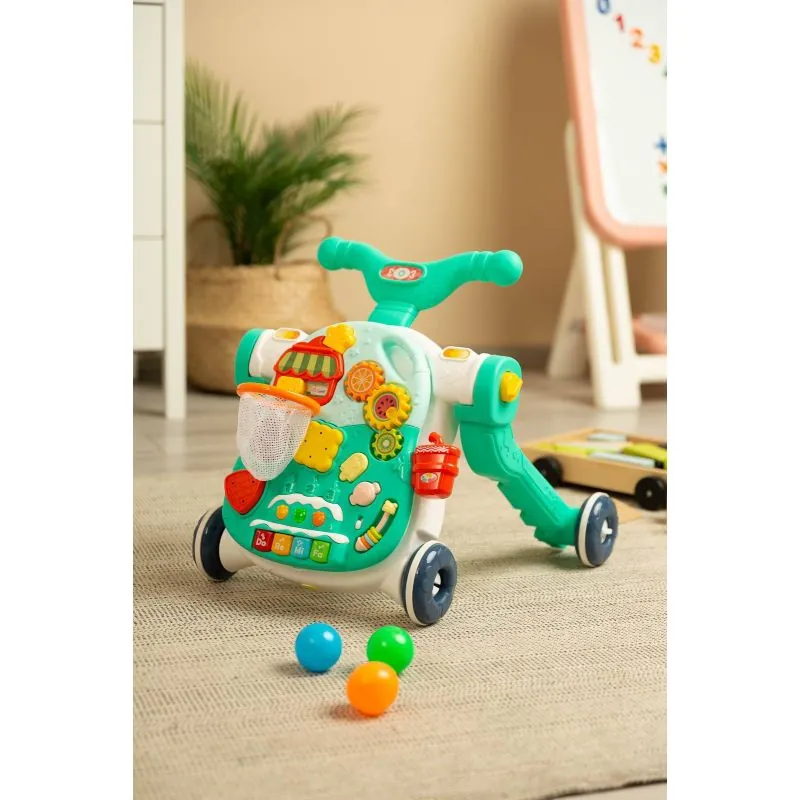 Daudzveidīgas lietošanas iespējas, krāsaini elementi un muzikālais panelis ļaus mazulim spēlēties stundām ilgi. Lai bērns gūtu pēc iespējas vairāk pieredzes, rotaļlietu var salocīt 5 dažādos veidos:staigulis, skrejritenis, šūpojošs transportlīdzeklis, stumjama mašīnīte,galds. Rotaļlieta piemērota bērniem no 12 mēnešu vecuma.Viegla montāžaDaudz interesantu melodiju, kas patiks bērnamTas palīdz attīstīt bērna koncentrēšanos un uzmanībuVeicina bērnu roku attīstībuIzmēri: 61 x 45,5 x 49,5 cm
