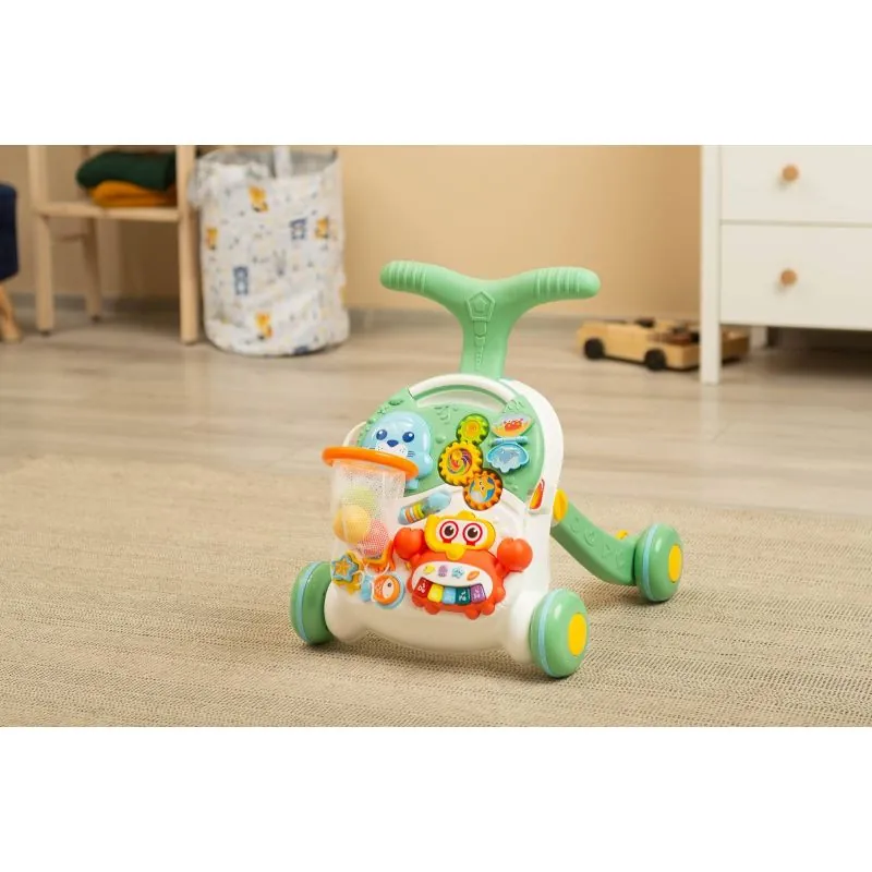 Staigulis Jūsu bērnam, kas palīdzēs piecelties un spert pirmos soļus;Pasteļu krāsu staigulis palīdz saglabāt līdzsvaru;Aizmugurējie riteņi ar mīkstu protektoru nodrošina stabilu atbalstu un neatstāj pēdas uz mājas grīdām;Aizmugurējie riteņi ir fiksējami, lai negrieztos;Ērts stumšanas rokturis;Ritenis, formas, grozs ar bumbiņām, rotējošs grabulis - tas viss bērna spēlēm un attīstībai;Ar skaņām un mūziku;Izņemams mini klavieres;Dažādas rotaļlietas;Pārvēršas par galdiņu uz kājiņām;Paredzēts bērniem no 6 līdz 36 mēnešiem;Nepieciešamas AA baterijas (nav iekļautas).Eiropas standarts EN 71, EN 62115;