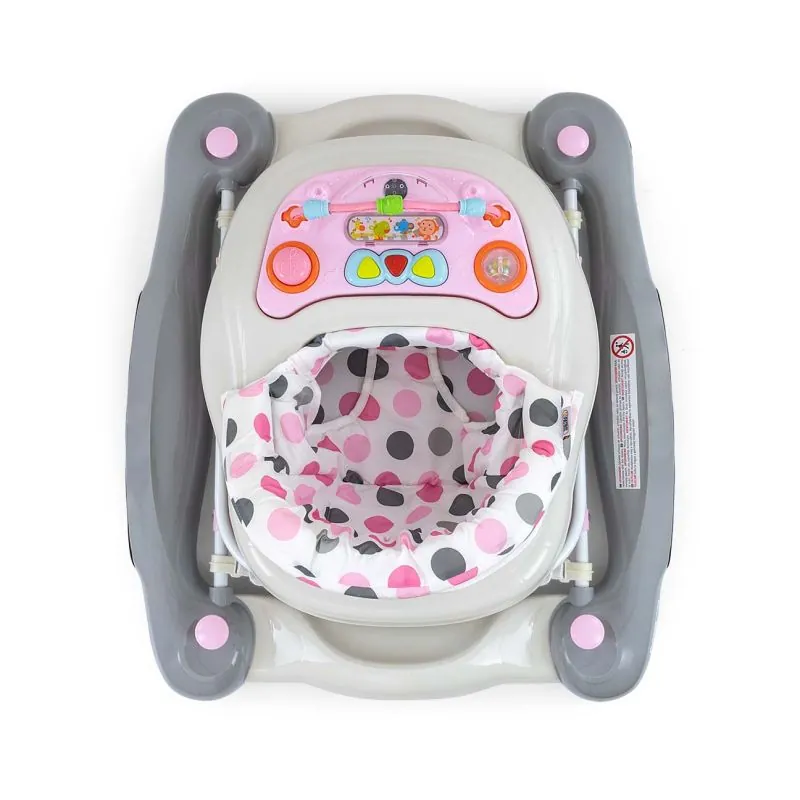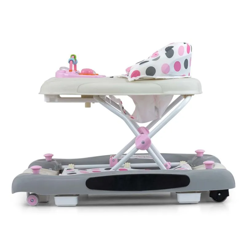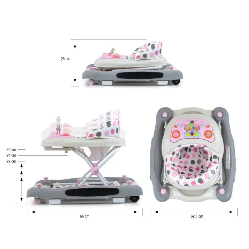Četri kvalitatīvi riteņi, kas neskrāpē virsmu, pa kuru tie pārvietojas, nodrošina pārvietošanās brīvību, seši gumijas aizbāžņi aizsargās bērnu no slīdēšanas pa kāpnēm vai citām šķēršļiem.