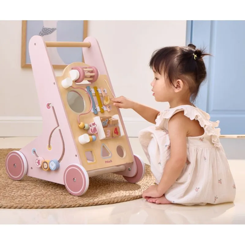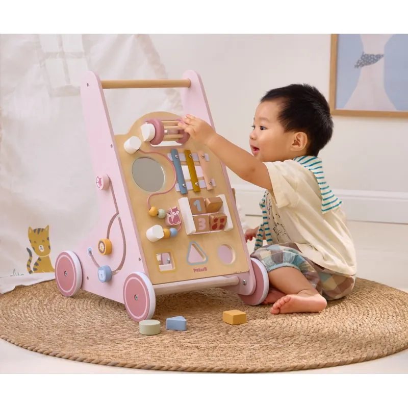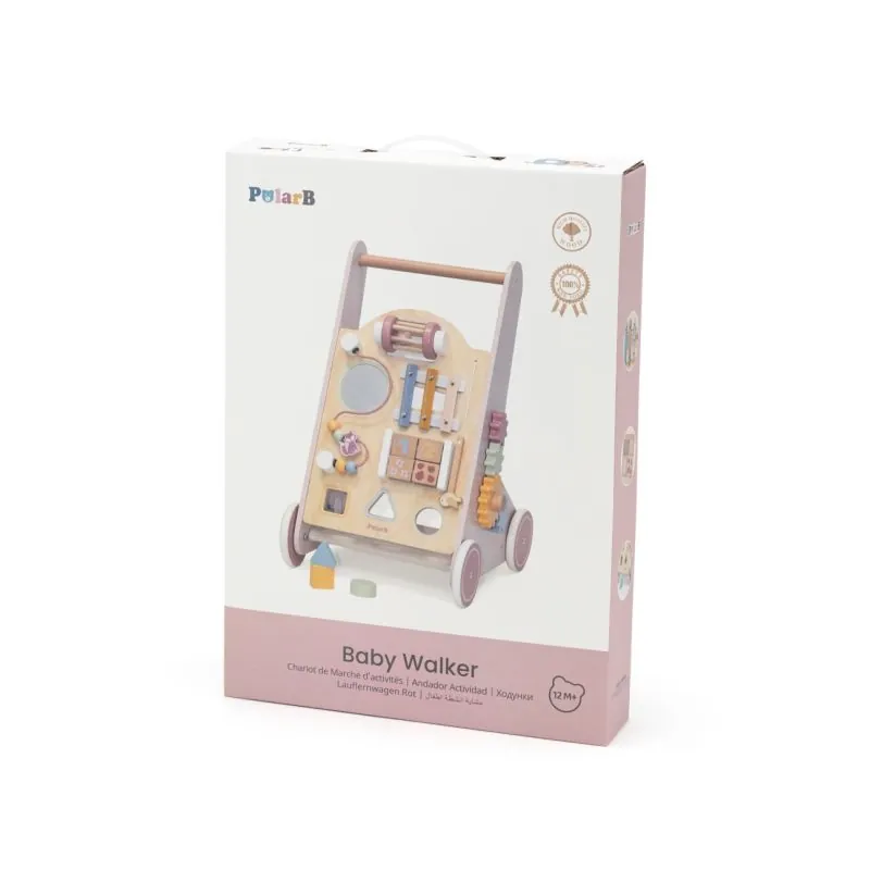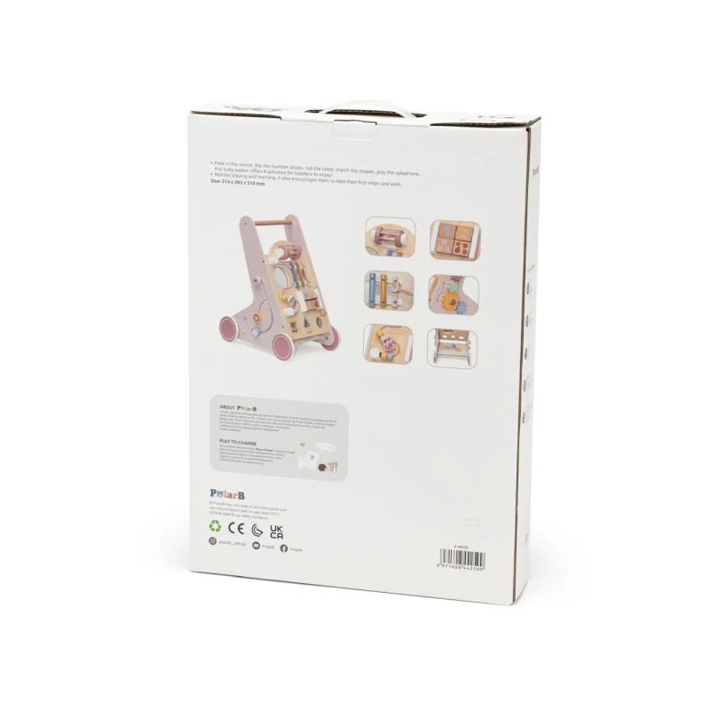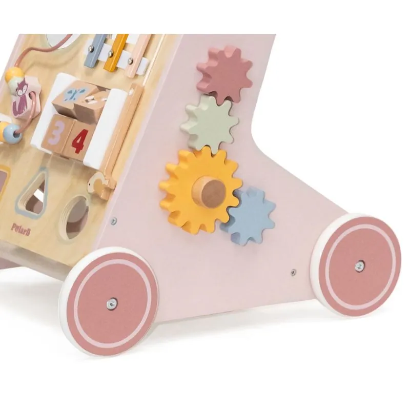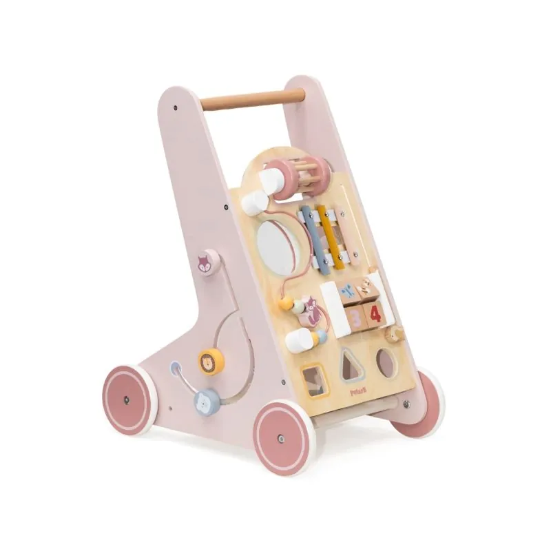 Daudzfunkcionāls koka staigulis ar riteņiem un daudz interesantu aktivitāšu;Izgatavots no augstas kvalitātes koka, pārklāts ar bērniem nekaitīgām krāsām;Uz staiguļa priekšējās sienas daudz spēļu elementu, kas attīstīs bērna motoriskās prasmes, veicinās radošumu;Griežamas, kustīgas detaļas, l, marakass, metalofons, zobrati, formu šķirotājs;Ieteicamais vecums: 12+ mēneši;Izmēri: 39,3x50,1x31,4 cm.;Svars: 2,3 kg.