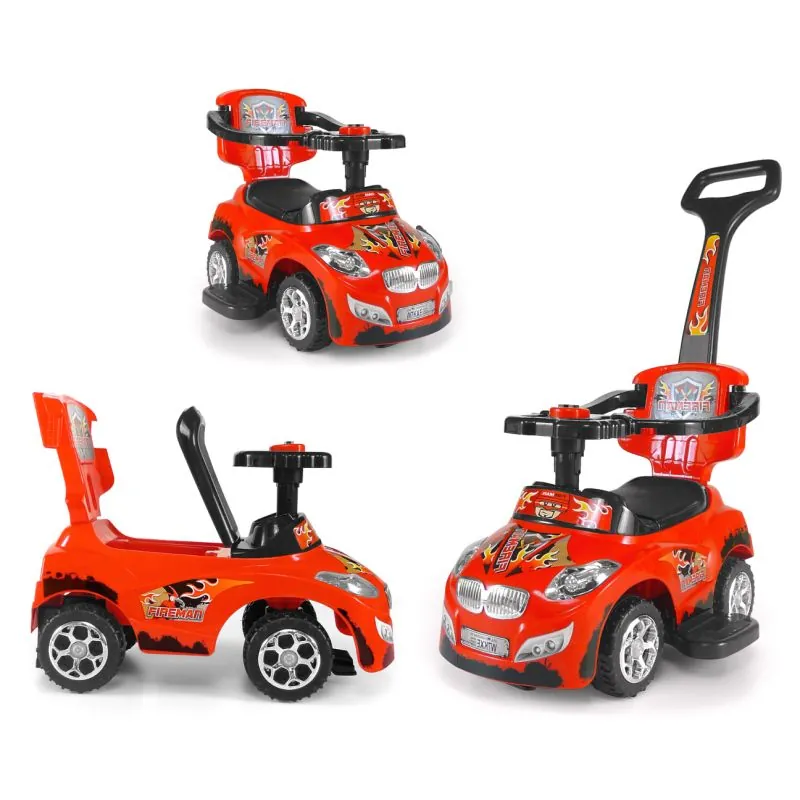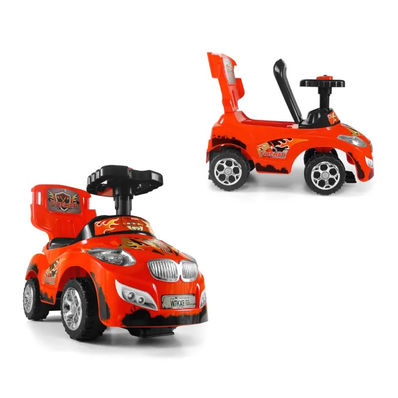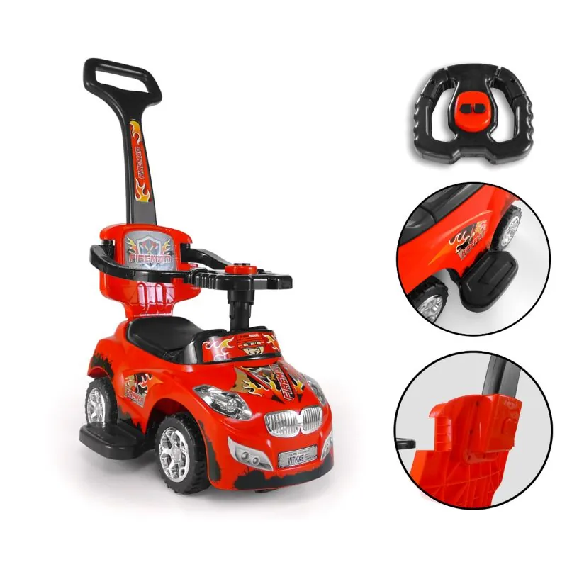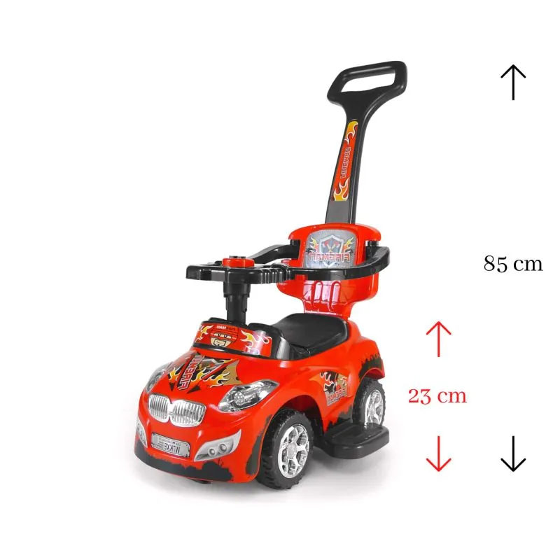Priekšējie vērpes riteņi, vadāmi ar stūres sviru;Stūre ar skaņas signālu un jautrām melodijām;Šim auto ir aizsardzība pret sānu un atpakaļejošu apgāšanos, kāju balsti un rokturis auto stumšanai;Šos piederumus varēs noņemt, kad bērns vēlēsies braukt ar auto pats;Nodalījums zem sēdekļa.Ērts un elegants eco ādas sēdeklis ar atzveltni;Metāla riteņu asis;Noņemami aizsargmargas un atzveltne;Aizsardzība pret transportlīdzekļa apgāšanos;Interaktīvs stūre;Vecums 18-36 mēn.