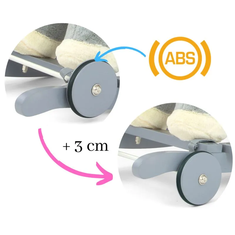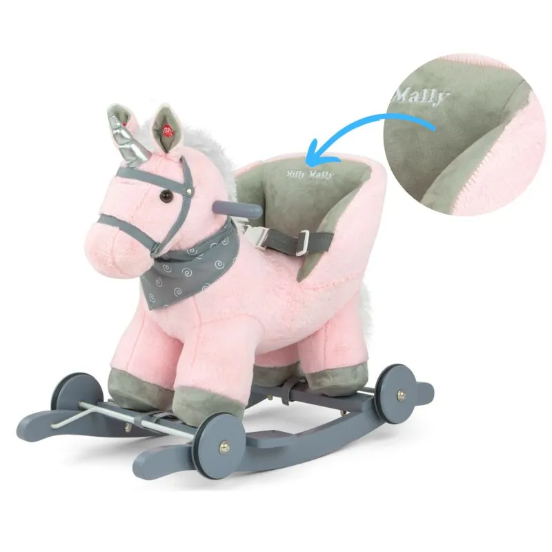 Mīkstais šūpojošais zirgs Polly bija paredzēts pašiem mazākajiem bērniem (12m+), kuriem tradicionālie šūpojošie zirgi ir pārāk lieli; Ērts mīkstas formas sēdeklis un regulējamas siksnas nodrošina komfortu un drošību, kad mazulis bezrūpīgi šūpojas; Zirgam ir koka šūpoles ar kāju balstiem un rokturiem, kas palīdzēs saglabāt līdzsvaru spēlējoties;Salokāmu riteņu komplekts, pateicoties kuram dažu sekunžu laikā zirgu pārvērtīsiet par brīnišķīgu plīša transportlīdzekli; Izgatavots no mīksta un maiga plīša materiāla;Ir iemaukti, kāju balsti un interaktīvas ausis;Nospiežot vienu ausi, dzirdēsiet zirga rikšošanu un zvaniņu, bet, ja pieskarsieties otrai, bērns dzirdēs jautru zirga zviegšanu;Spēlējoties mazulis ir jāsaskaņo savas kustības ar zirgu, tas veicina viņa motorisko koordināciju, attīsta iztēli, uzlabo līdzsvara sajūtu; Regulējamas drošības siksnasParedzēts bērniem līdz 30 kg.