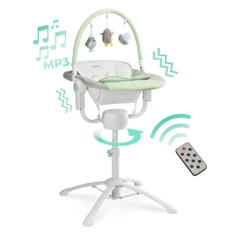 3in1: barošanas krēsls (0–15 kg.), šūpuļkrēsls (0–12 kg.) un bērnu šūpoles (0–9 kg.);Pateicoties tam, jūs varat visu laiku vērot bērnu; Šūpoļu variants ir aprīkots ar vibrācijas funkciju, rotāciju un integrētām melodijām; Jūs varat vadīt šūpoles ar tālvadības pulti;3 slīpuma leņķi, atkarībā no veicamās funkcijas;Bagātīgs melodiju un skaņu komplekts;3 taimeru funkciju iestatījumi;Nomierinoša vibrācija;6 šūpošanās ātrumi;Regulējams, noņemams rotaļlietu loks;Praktiski un viegli tīrāmi apšuvumi;Papildu, noņemams polsterējums;Barošana no tīkla vai 4 AA 1,5 V baterijas;4 līmeņu regulējams augstums;Salocīts aizņem ļoti maz vietas, tāpēc viegli atradīs savu vietu mājās, kā arī būs ērts ceļojumos;5 punktu drošības jostas;Atbilst Eiropas standartiem: EN 16232:2014; EN 12790:2011; EN 14988:2017Svars: 6,1 kg.