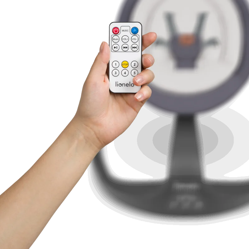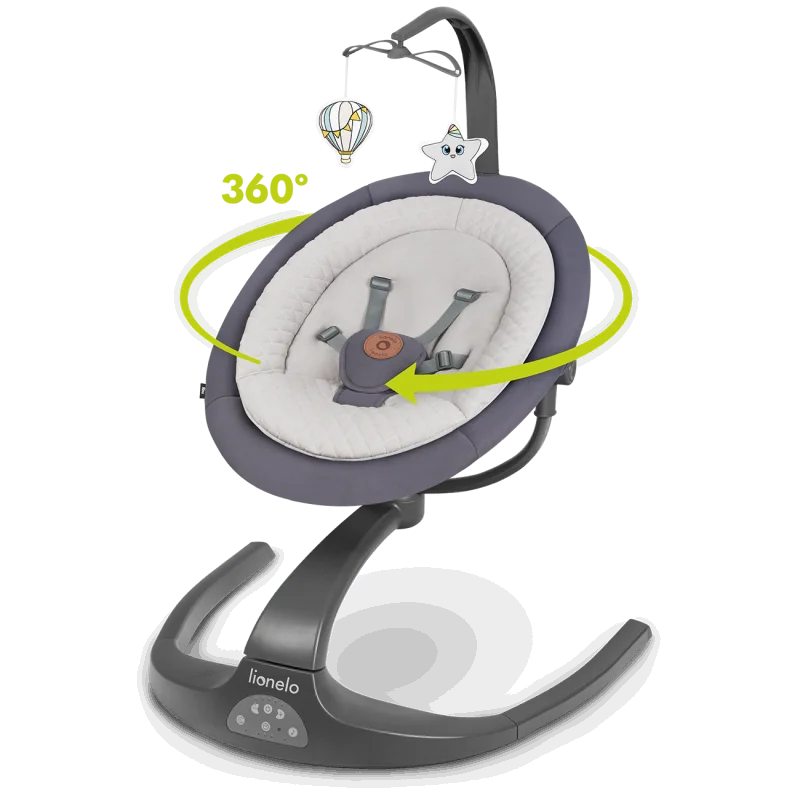 360° rotējošs sēdeklisDivi šūpošanās virzieni: uz priekšu-atpakaļ un uz sāniem (pa labi-pa kreisi)2 pakāpju atzveltnes slīpuma regulēšanaNo dzimšanas līdz bērna svaram 9 kg (vai līdz brīdim, kad viņš sāk sēdēt pats)Šūpošanās bloķētājs (noraidīšanas funkcija)5 soļu šūpošanās ātruma regulēšanaTaimeri var iestatīt uz 8, 15 vai 30 minūtēmAutomātiska kustības noteikšanaMūzikas atskaņošana – 12 nomierinošas melodijasPieskarieties vadības panelim vai attālināti, izmantojot tālvadības pultiPlaša, piemērotas kontūras atzveltneTīkla pārvalka apakša, kas nodrošina labu gaisa cirkulācijuMīksts, ērts spilvens5 punktu drošības jostasStienis ar divām rotaļlietāmBarošana no baterijas vai tīkla - USB ievade