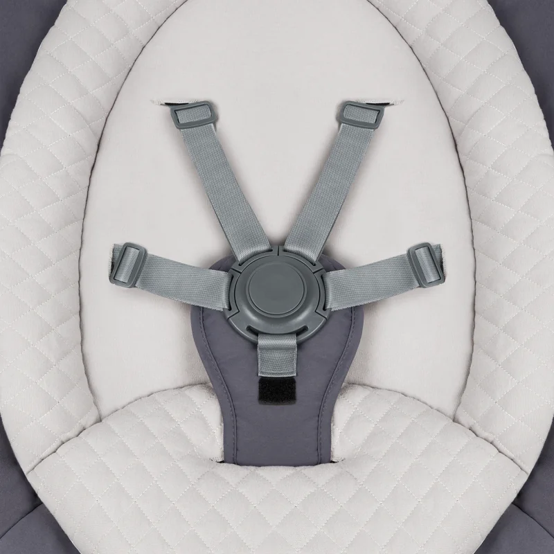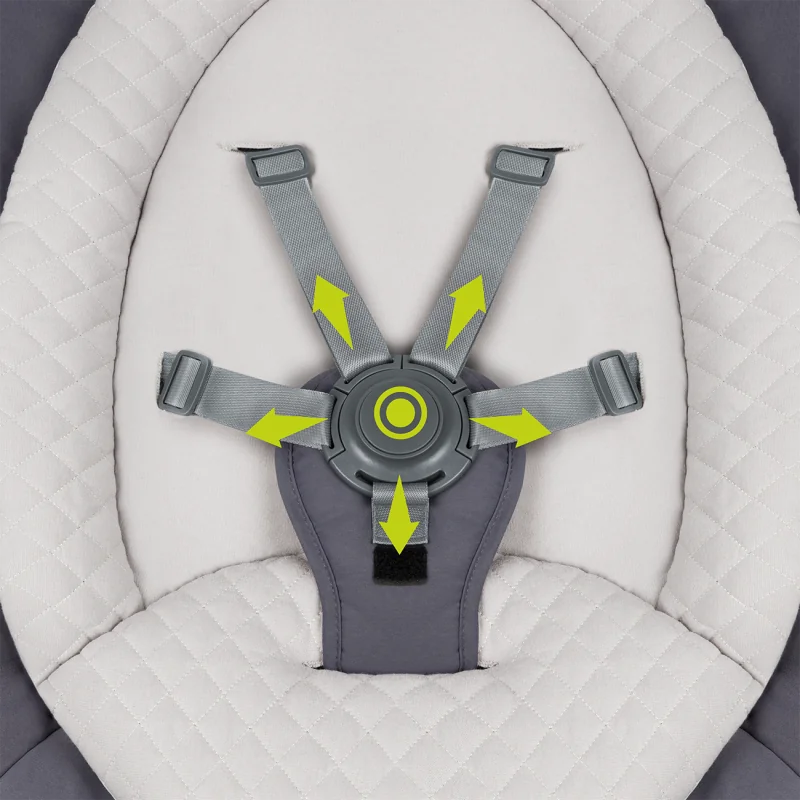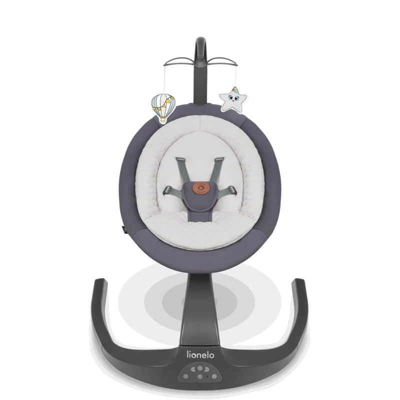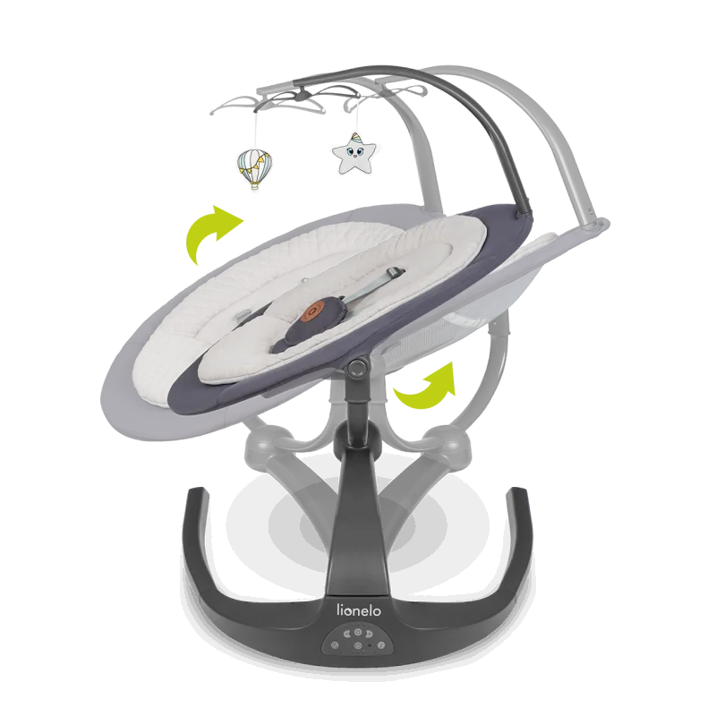 360° rotējošs sēdeklisDivi šūpošanās virzieni: uz priekšu-atpakaļ un uz sāniem (pa labi-pa kreisi)2 pakāpju atzveltnes slīpuma regulēšanaNo dzimšanas līdz bērna svaram 9 kg (vai līdz brīdim, kad viņš sāk sēdēt pats)Šūpošanās bloķētājs (noraidīšanas funkcija)5 soļu šūpošanās ātruma regulēšanaTaimeri var iestatīt uz 8, 15 vai 30 minūtēmAutomātiska kustības noteikšanaMūzikas atskaņošana – 12 nomierinošas melodijasPieskarieties vadības panelim vai attālināti, izmantojot tālvadības pultiPlaša, piemērotas kontūras atzveltneTīkla pārvalka apakša, kas nodrošina labu gaisa cirkulācijuMīksts, ērts spilvens5 punktu drošības jostasStienis ar divām rotaļlietāmBarošana no baterijas vai tīkla - USB ievade