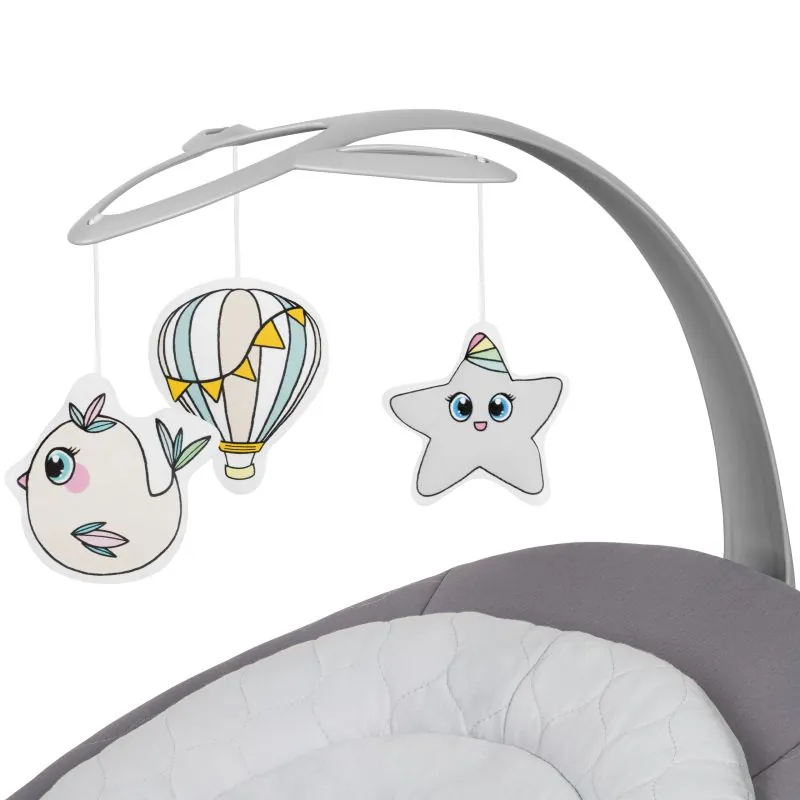 Lai bērnam būtu jautri, šūpuļkrēsls ir aprīkots ar regulējamu rotaļlietu stieni un pat 12 iepriekš ielādētām melodijām un 2 dabas skaņām;