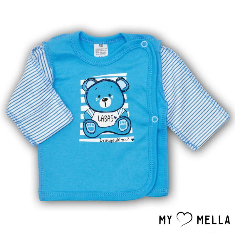 Spēlīgs un stilīgs krekliņš mazulim "Sveiki".Saskaņots moderns dizains un tradīciju praktiskums.Ļoti mīksts kokvilnas krekliņš, piemērots kā virsdrēbes vai miega apģērbs.Jūsu un mazuļa ērtībai ir sānu (kimono stila) aizdare – tas ir lielisks risinājums jaundzimušajiem.Var iegādāties šīs kolekcijas: kombinezonu, bodiju, biksītes.Mazgāt 40 grādu temperatūrā.Izstrādāts Lietuvā!