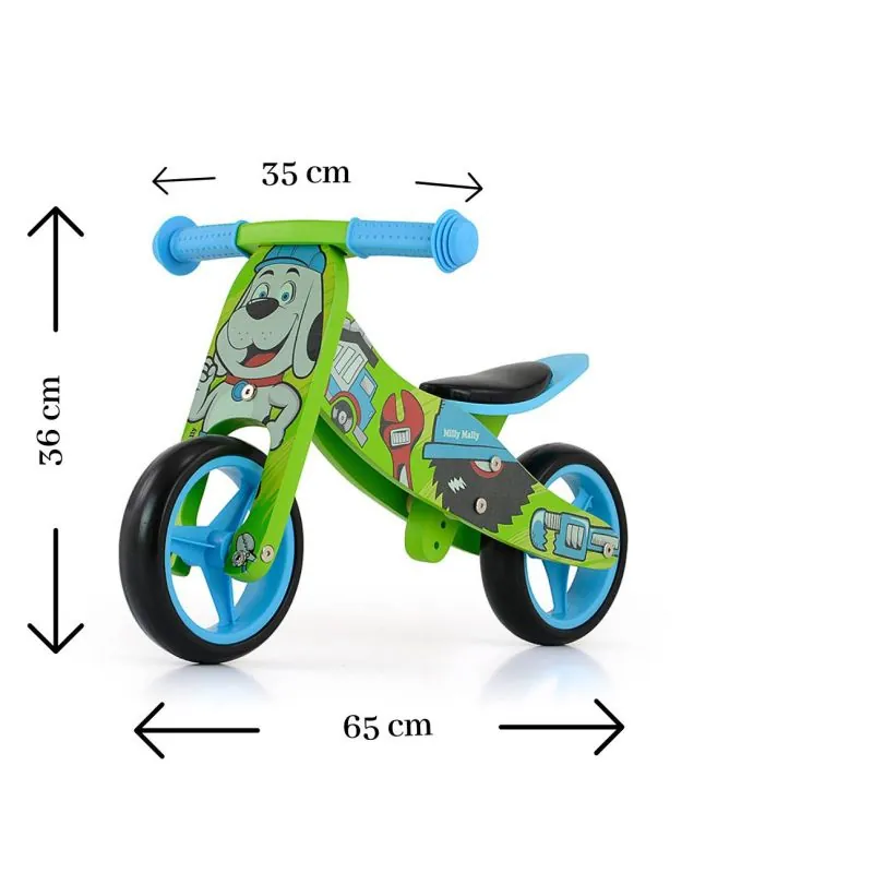 Koka rāmis.Neslīdoši rokturi ar korpusiem.7" putupolistirola riteņi.3 pakāpju sēdekļa augstuma regulēšana.Vienkāršie gultņi.Divfunkcionalitāte (trīsritenis vai dubultais ritenis).Maksimālā slodze 25 kg.Paredzēts bērniem 18-36 mēneši.Atbilst Eiropas drošības standartiem.Izmēri: augstums 36 cm, garums 65 cm